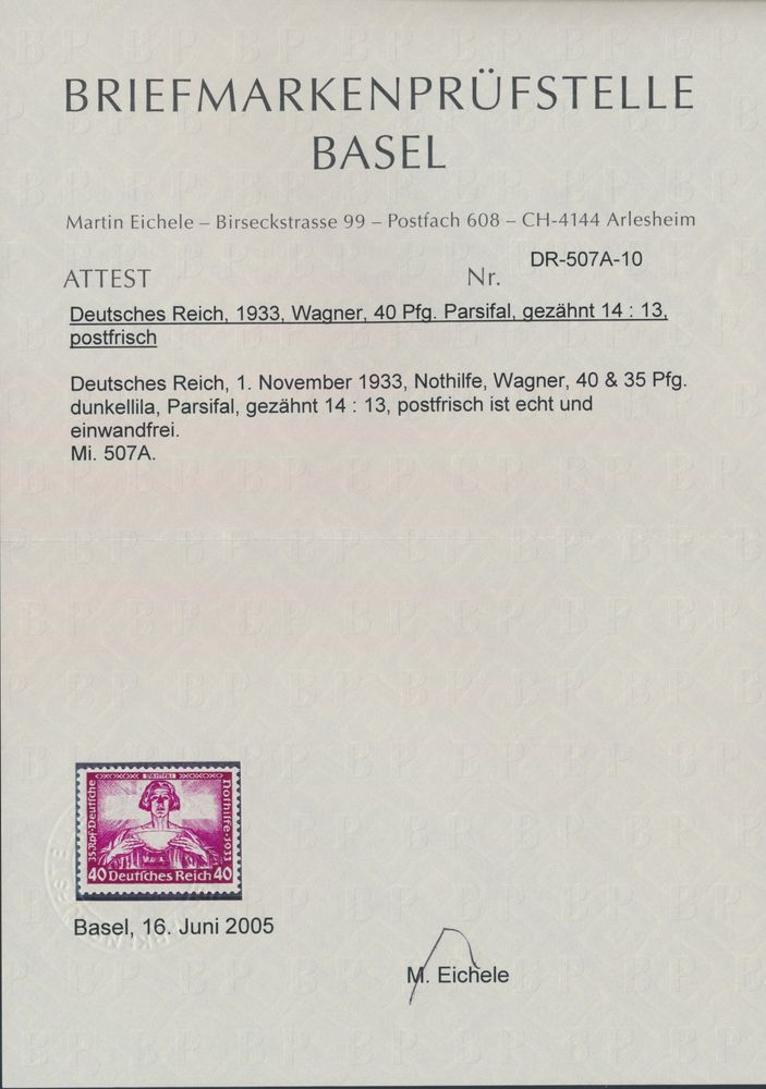 3233 nh imageN° 507A "1933 Wagner 40 + 35pf. Parzifal", Eichele certificate, vf (Mi. €950)(Image 1) (Image 2)