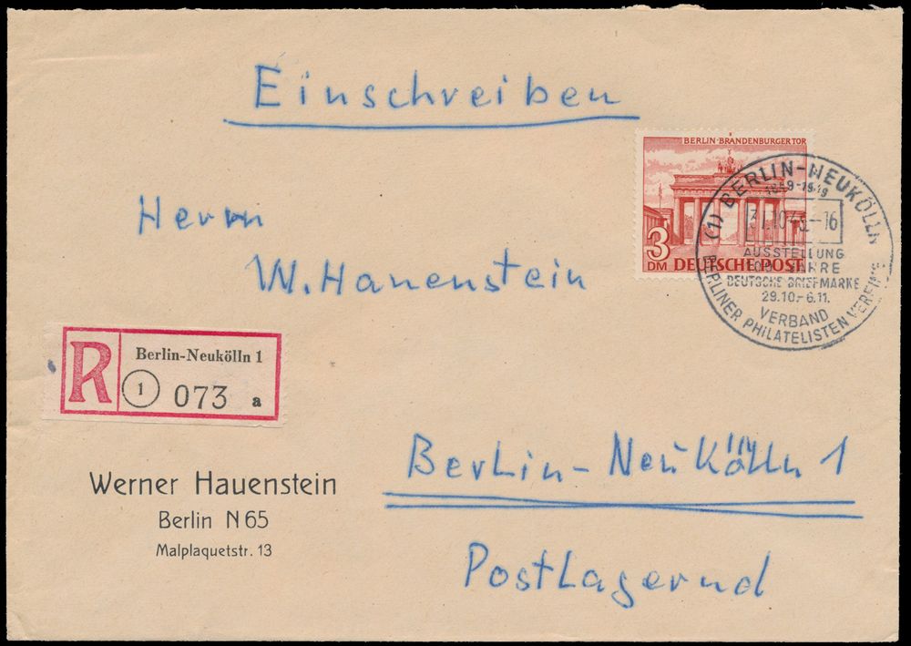 3273 image1949 registered cover sent within Berlin and franked with a 3M red (Michel 59, cat. value €700 on cover) tied by "100 Years of German Stamps" Philatelic Exhibition special postmak dated 31.10.1949, arrival c.d.s. on the back, vf(Image 1) (Image 2)