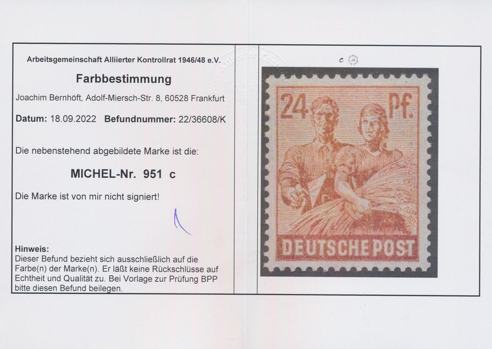 3266 nh imageN° 951c "1947 - 24pf. dunkelgelbbraun", certificate (for colour), J. Bernhöft, vf (Mi. €350)(Image 1) (Image 2)