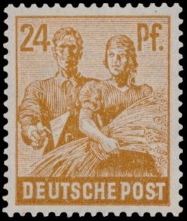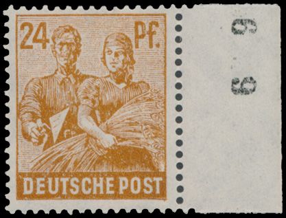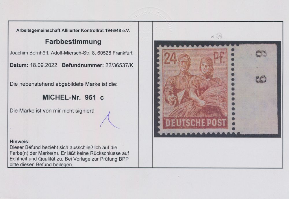 3267 nh imageN° 951C "1947 - 24pf. dark yellow-brown" with right margin, certificate (for colour), J. Bernhöft, vf (Mi. €350)(Image 1) (Image 2)