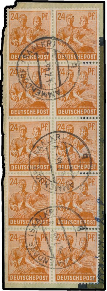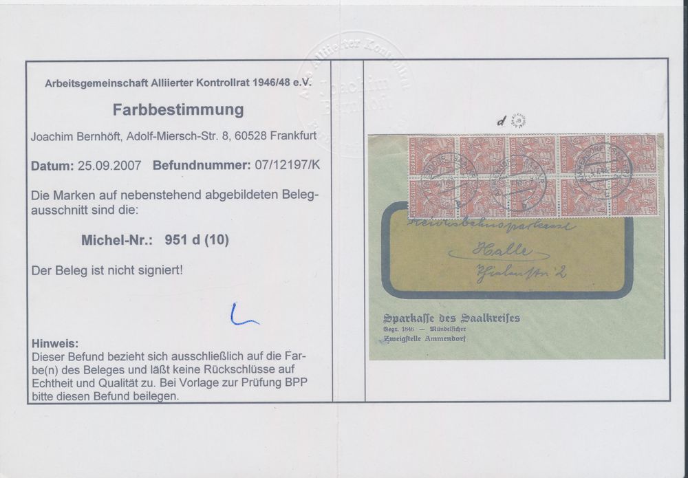 3268 0 imageN° 951d "1947 - 24pf. Lebhaftbraunorange" souvenir sheet of 10 on fragment certificate (for colour), J. Bernhöft, vf (Mi. €1,800)(Image 1) (Image 2)