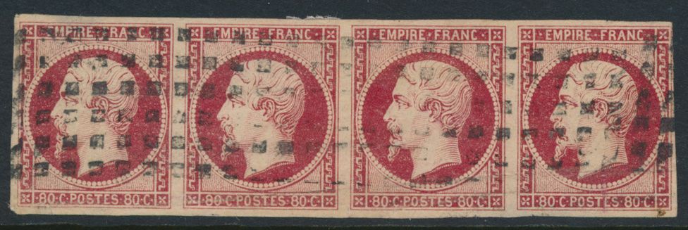 3319 0 imageN° 17A "1854 - Empire 80c. carmine" in strip of 4, left stamp slightly thin at top, right stamp close margin, still attractive, vf/f (Yv. €500)(Image 1)