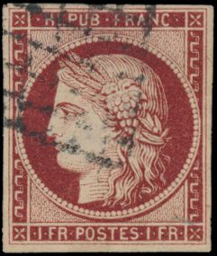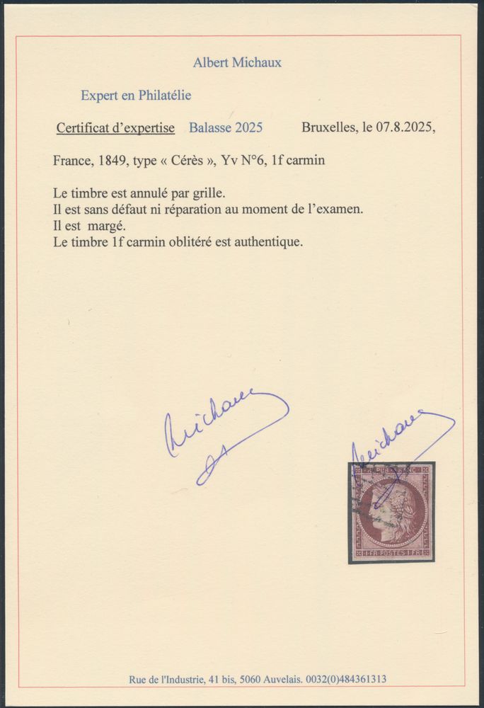 3316 0 imageN° 6 "1849 - Cérès - 1fr. carmine", some irregularities in paper, fully margined, with photo certificate, vf (Yv. €1,000)(Image 1) (Image 2)