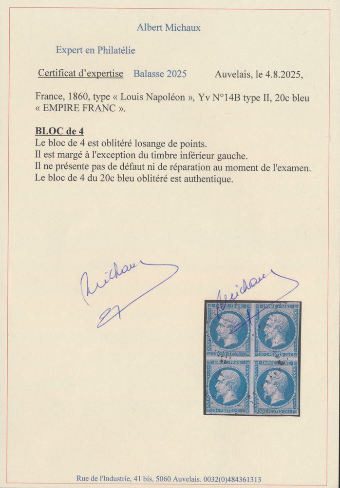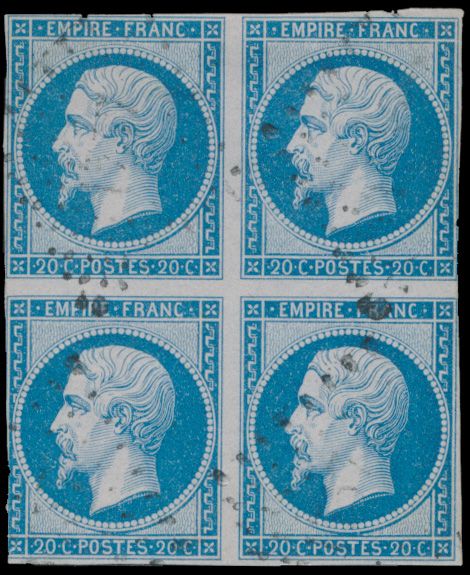 3318 0 imageN° 14B type II "1860 - Napoléon III - 20c. bleu" in block of four, slightly cut close at bottom left, with photo certificate, vf/f (Yv. €500)(Image 1) (Image 2)