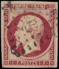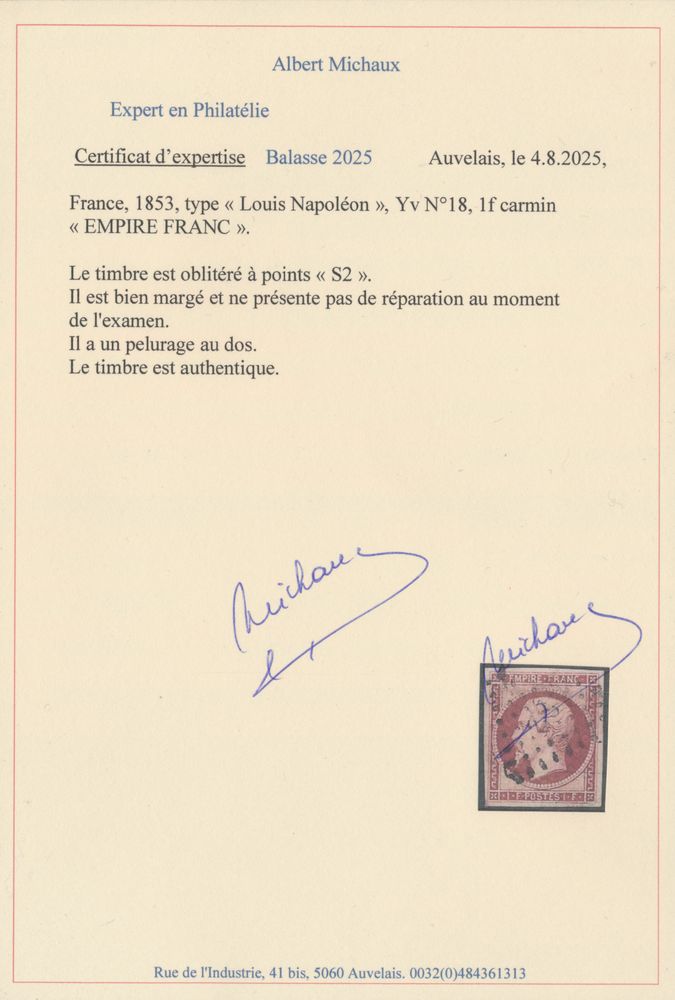 3320 0 imageN° 18 "1853 - Napoleon III Empire - 1fr. carmine", nice margin, with photo certificate, vf (Yv. €3,400)(Image 1) (Image 2)