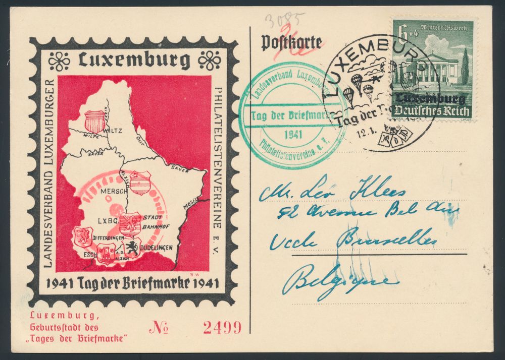 3308 image1941 German postcard, issued in honour of the "1941 Tag der Briefmarke", Luxembourg, numbered N° 2499, nice cancellation, refranked with German occupation stamp n° 4, overprint "Luxembourg", dated 12 January 1941, to Uccle (Bruxelles), vf(Image 1) (Image 2)