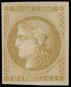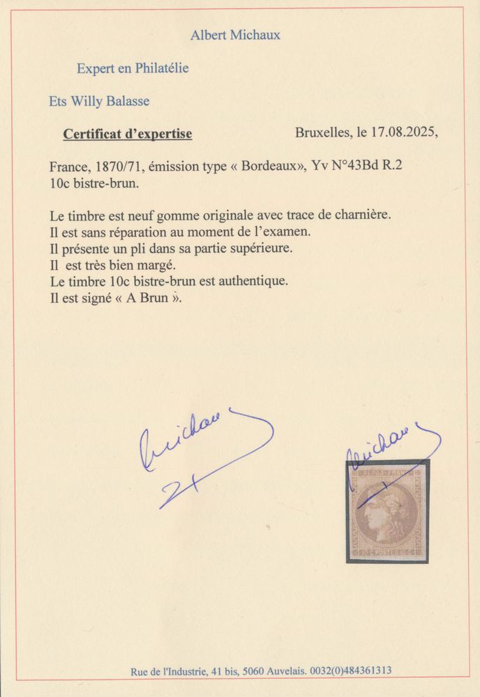 3334 og imageN° 43Bd "1871 - 10c. bistre-brun", slight crease, with Brun sign, Balasse photo certificate, f (Yv. €1,700)(Image 1) (Image 2)
