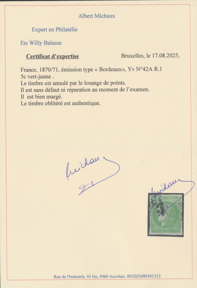 3332 0 imageN° 42A report 1 "1870 - 5c. vert-jaune", margin, with photo certificate, vf (Yv. €7,500)(Image 1) (Image 2)