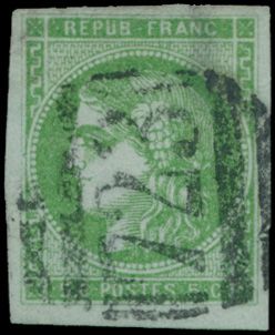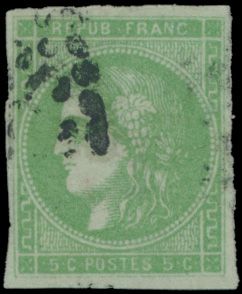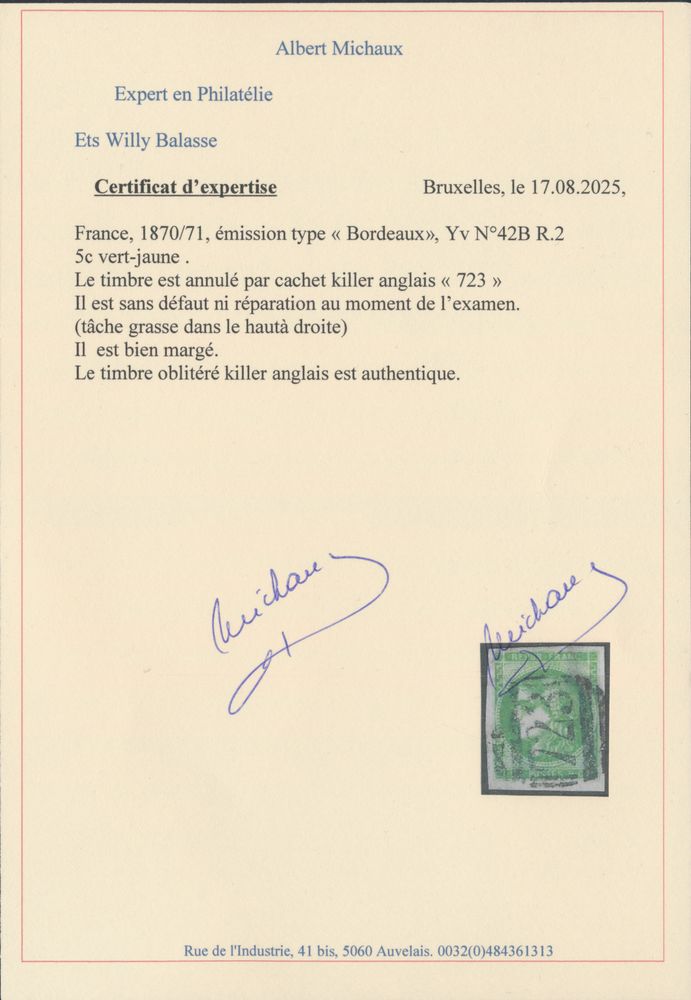 3333 0 imageN° 42B report 2 "1870 - 5c. vert-jaune", nicely margin, grease stain on the right, with English cancellation "723", rare, with photo certificate, vf/f (Yv. +€220)(Image 1) (Image 2)