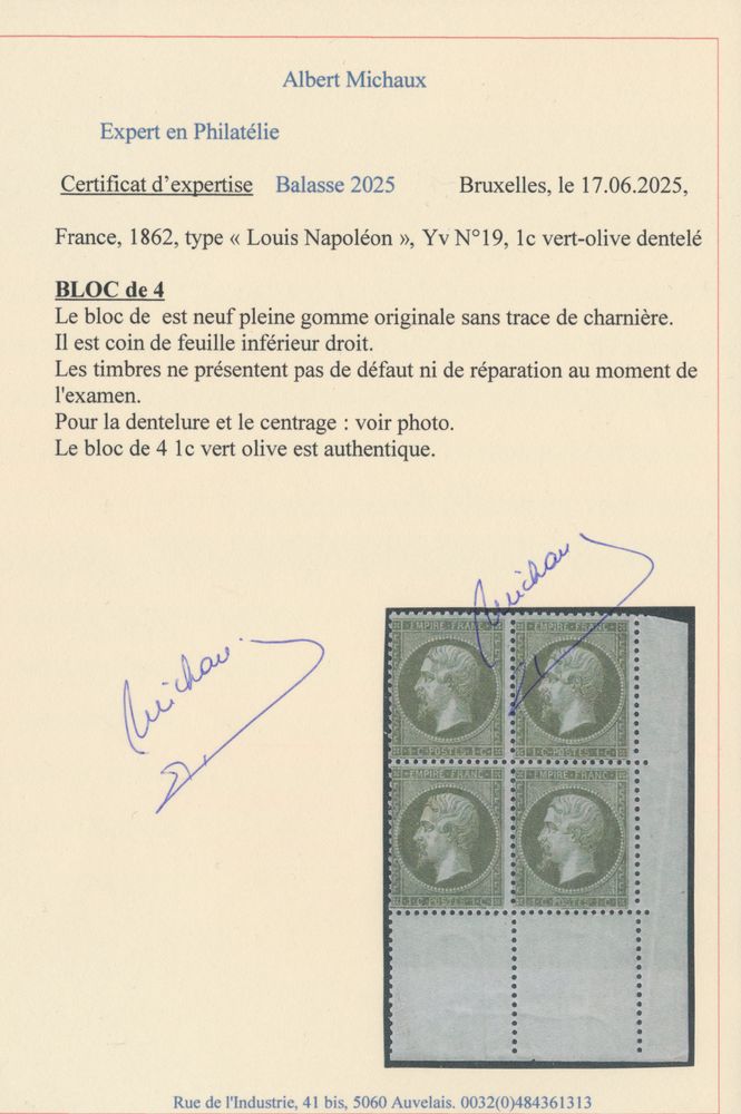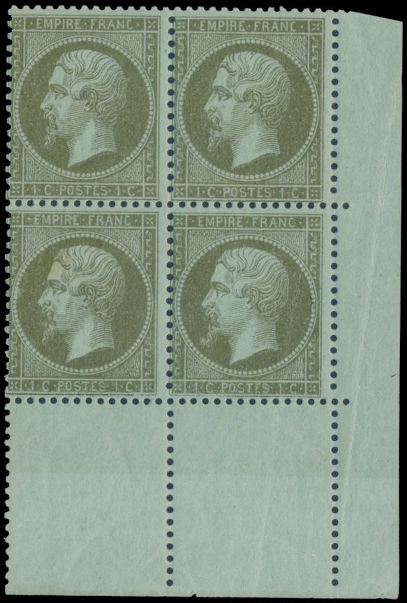 3321 nh imageN° 19 "1862 - Napoleon Empire - 1c. vert-olive", corner block of 4, mint with original gum, slight creases due to margin and 1 stamp, vf/f (Yv. ++€1,100)(Image 1) (Image 2)