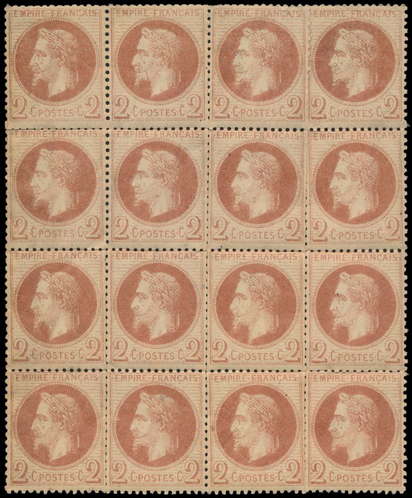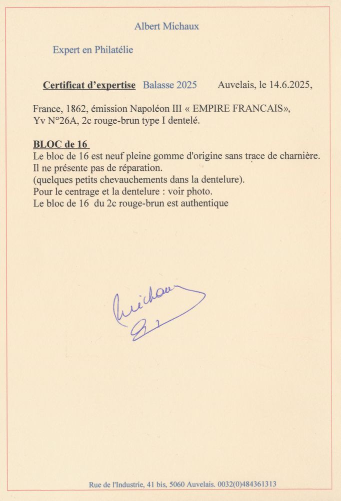 3324 nh imageN° 26A "1862 - Napoléon Lauré - 2c. rouge-brun", type I souvenir sheet of 16, slightly creased, perfs see photo, photo certificate, spectacular item, vf (Yv. ++€3,600)(Image 1) (Image 2)