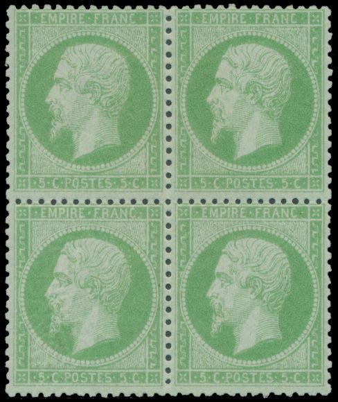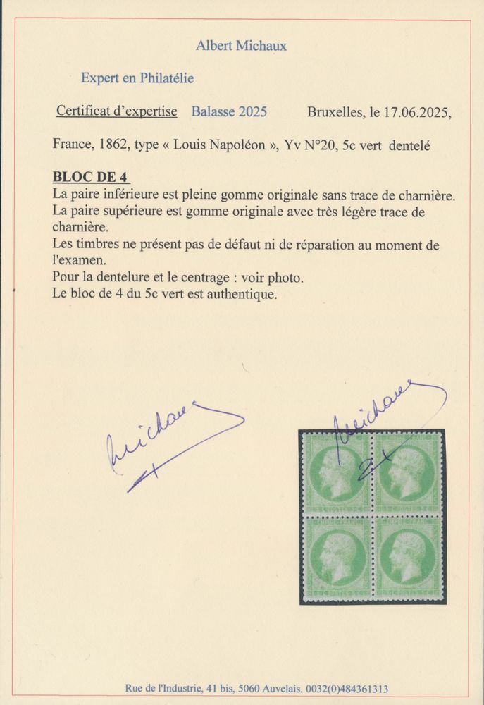 3323 nh/og imageN° 20 "1862 - Napoleon Empire - 5c. vert", block of four with hinge in upper pair, photo certificate, vf (Yv. +€1,750)(Image 1) (Image 2)