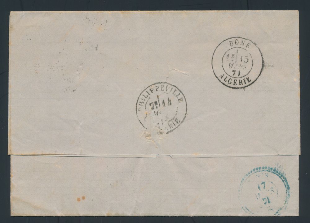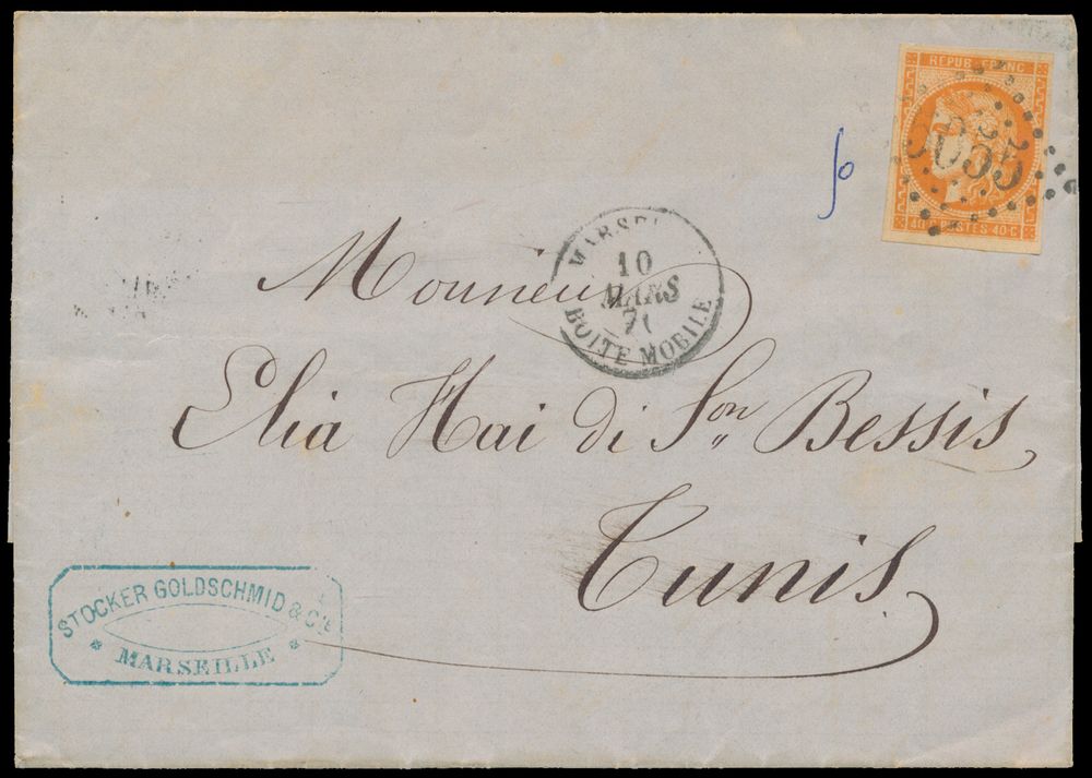 3337 image1871/10 March, letter via Marseille "boite mobile" to Tunis via Algeria with single franking N° 48, nicely margined stamp, superb specimen, vf (Yv. €1,000)(Image 1) (Image 2)