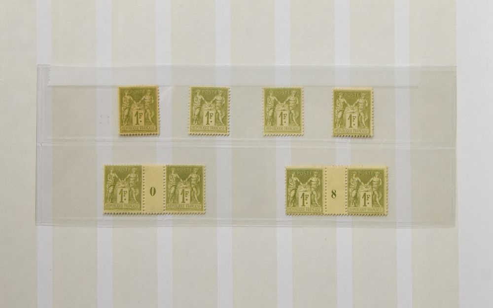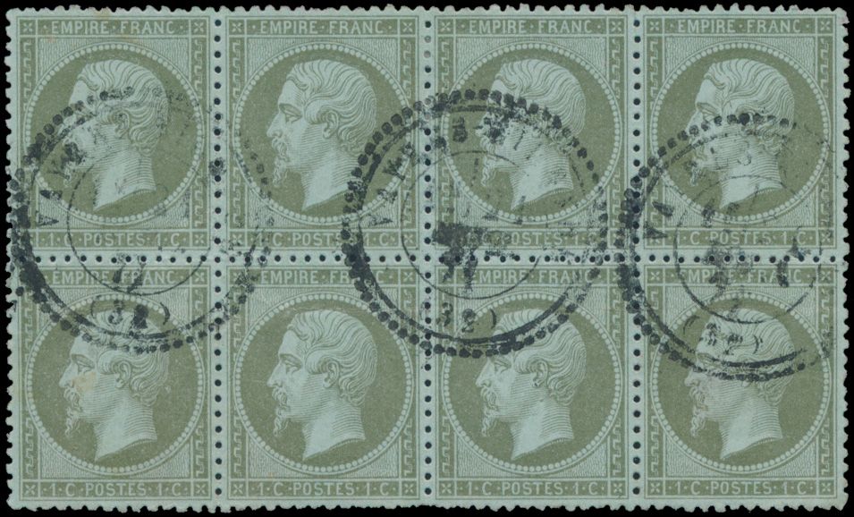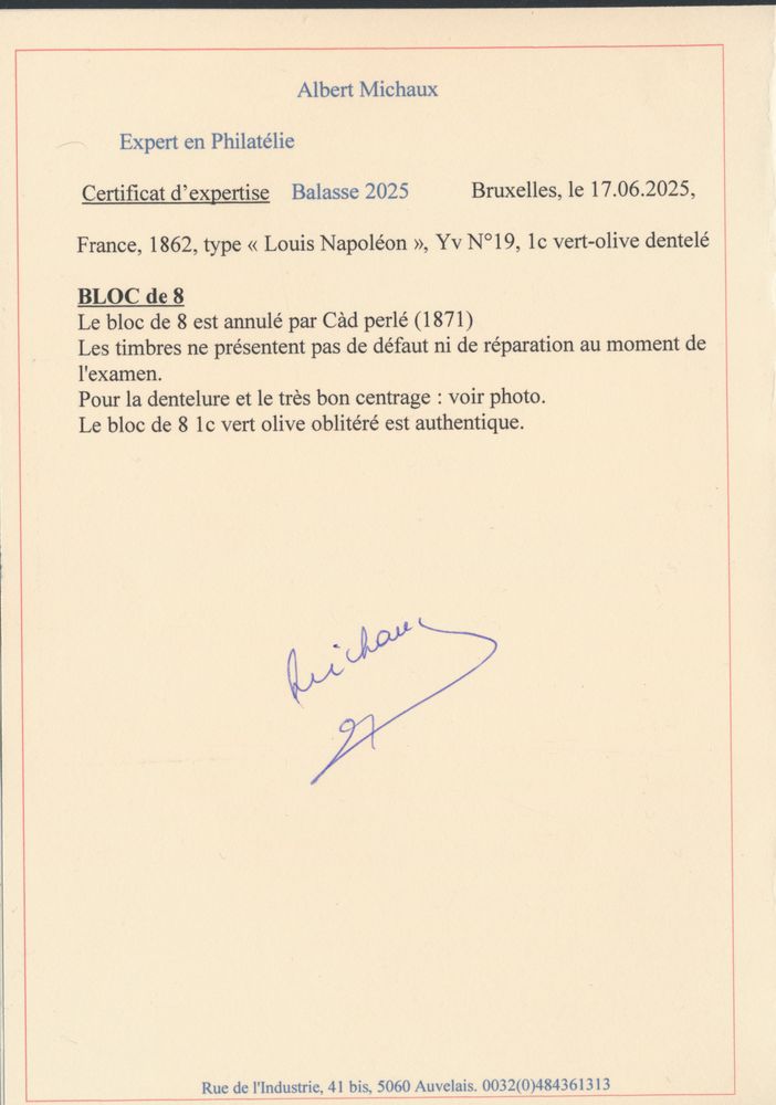 3322 0 imageN° 19 "1862 - Napoléon Empire - 1c. vert-olive" in souvenir sheet of 8, horizontal crease, photo certificate, f (Yv. +€800)(Image 1) (Image 2)