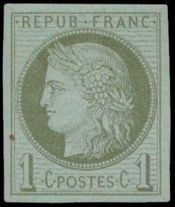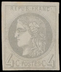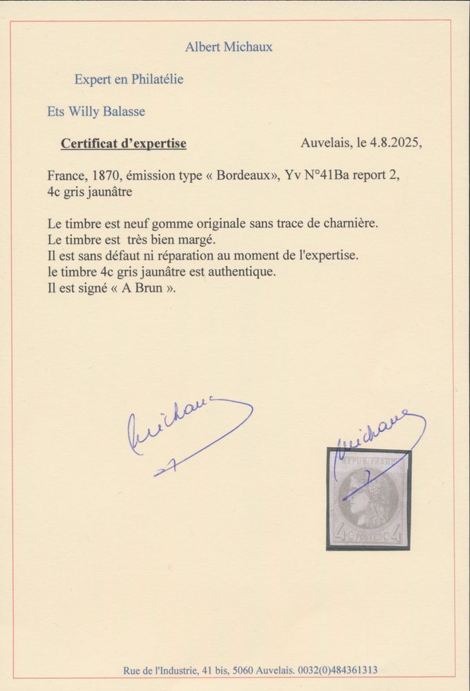 3331 og imageN° 41Ba, report 2 "1870 - 4c. grey-yellowish", minor gum damage due to hinge removal, Brun sign, Balasse photo certificate, vf (Yv. €425)(Image 1) (Image 2)