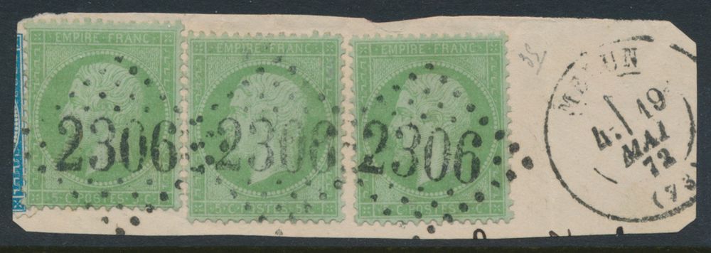 3327 0 imageN° 35 "Napoléon 5c. vert pâle s. bleu", 3x on fragment with cancellation "MELUN", vf (Yv. €690)(Image 1)