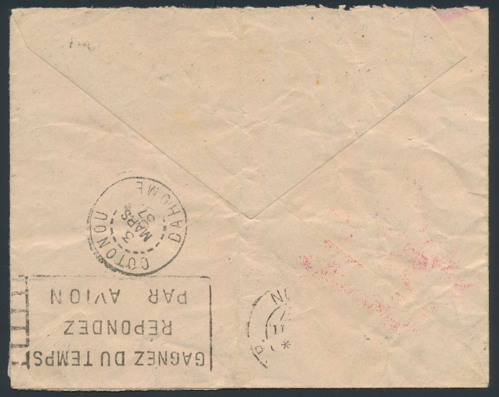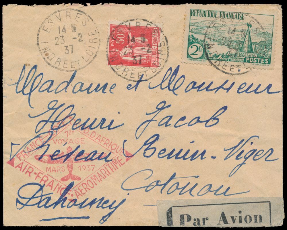 3366 image1937 N° 283 and 301 (Yv.), on letter envelope, from Esvres, dated 23 February 1937, to Cotonou (Benin), nice red lozenges cancellation of First flight March 1937, vf/f(Image 1) (Image 2)