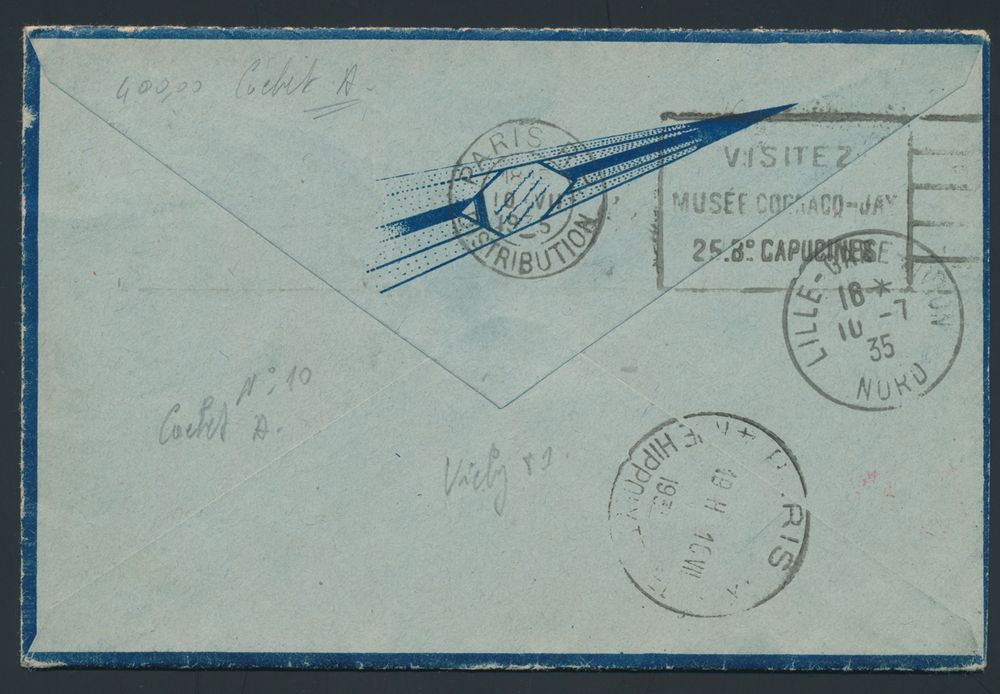 3365 image1935 N° 299 (2x) (Yv.), on letter cover "AIR-BLEU" with sticker "par Avion", from Lille (France), dated 10 July 1935, to Paris (France). On front, pretty pink cancellation "1 ste liaison Postale Aerienne Ste Air Bleu - 15 mai 1935 ", vf.(Image 1) (Image 2)