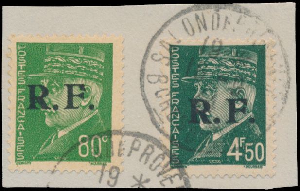 3368 0 image1944 Libération Salon de Provence "80c." and "4.50fr." cancelled on fragment, expertised Calves, rare, vf(Image 1)