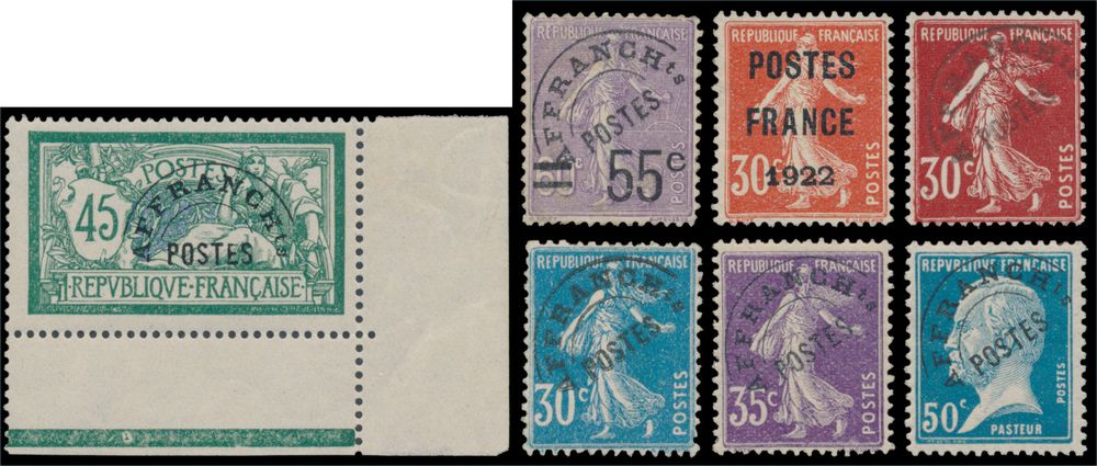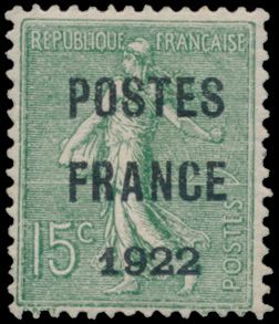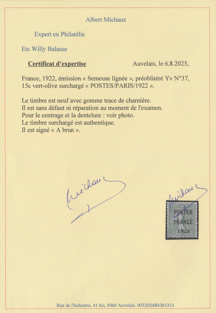 3373 og imageN° 37 '1922 - semeuse 15c. olive' with overprint Postes France 1922, Brun sign, Balasse certificate, rare, vf/f (Yv. €1,400)(Image 1) (Image 2)