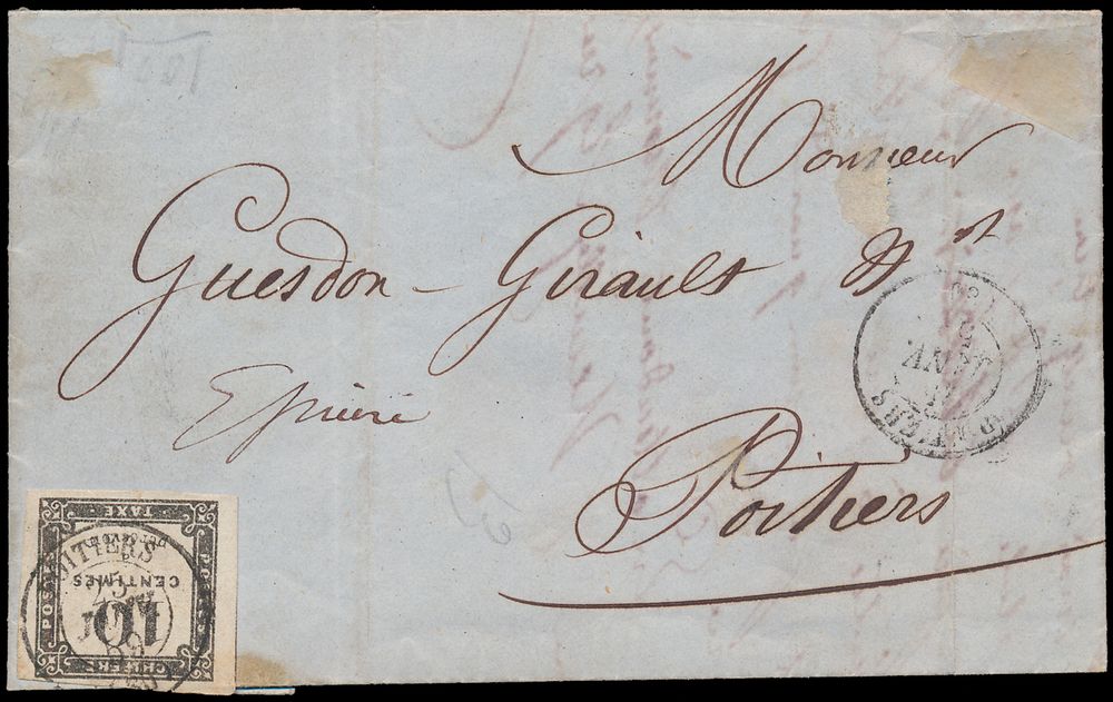 3379 image1859 T1 Taxe "10c. black" with lithographic printing on very nice letter from Poitiers, sent locally 25.1.1859, rare and very nice, vf (Yv. €850)(Image 1) (Image 2)