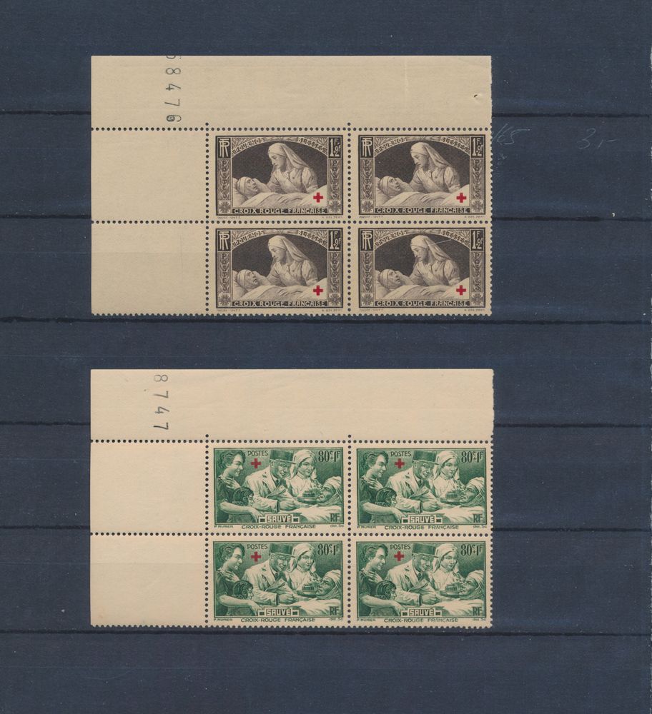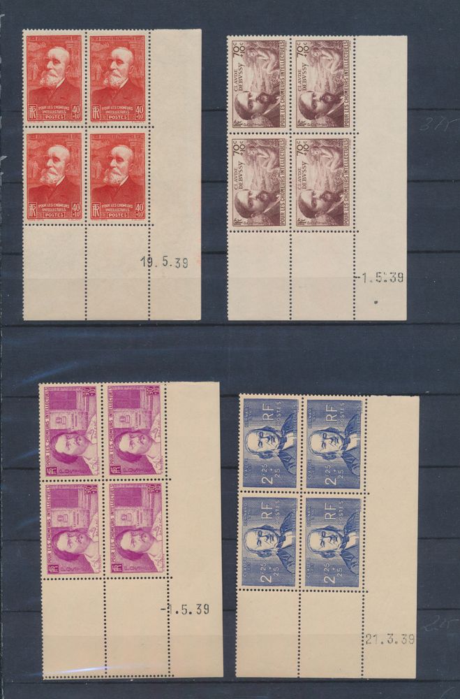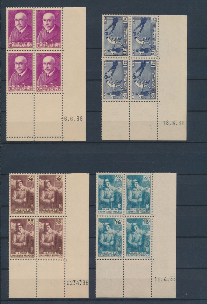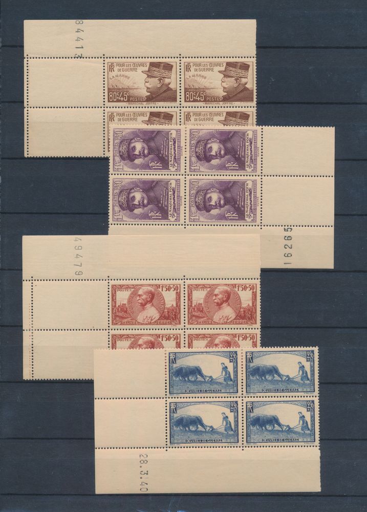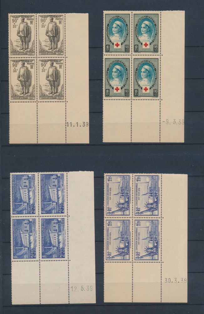 3362 nh/og imageNo. 454/57 'Oeuvre de Guerre - 1940', complete set in souvenir sheet of four stamps with corner piece and dated corner, perfectly mint, vf (Yv. €260) + 1938/1940 Small collection of dated corners from Yv. n° 377A, 386/87, 396, 420, 422, 426, 430, 436/39, 459/60, minor offset on some stamps, vf (Yv. €1.297)(Image 1) (Image 2) (Image 3) (Image 4) (Image 5)