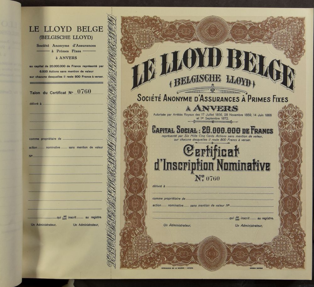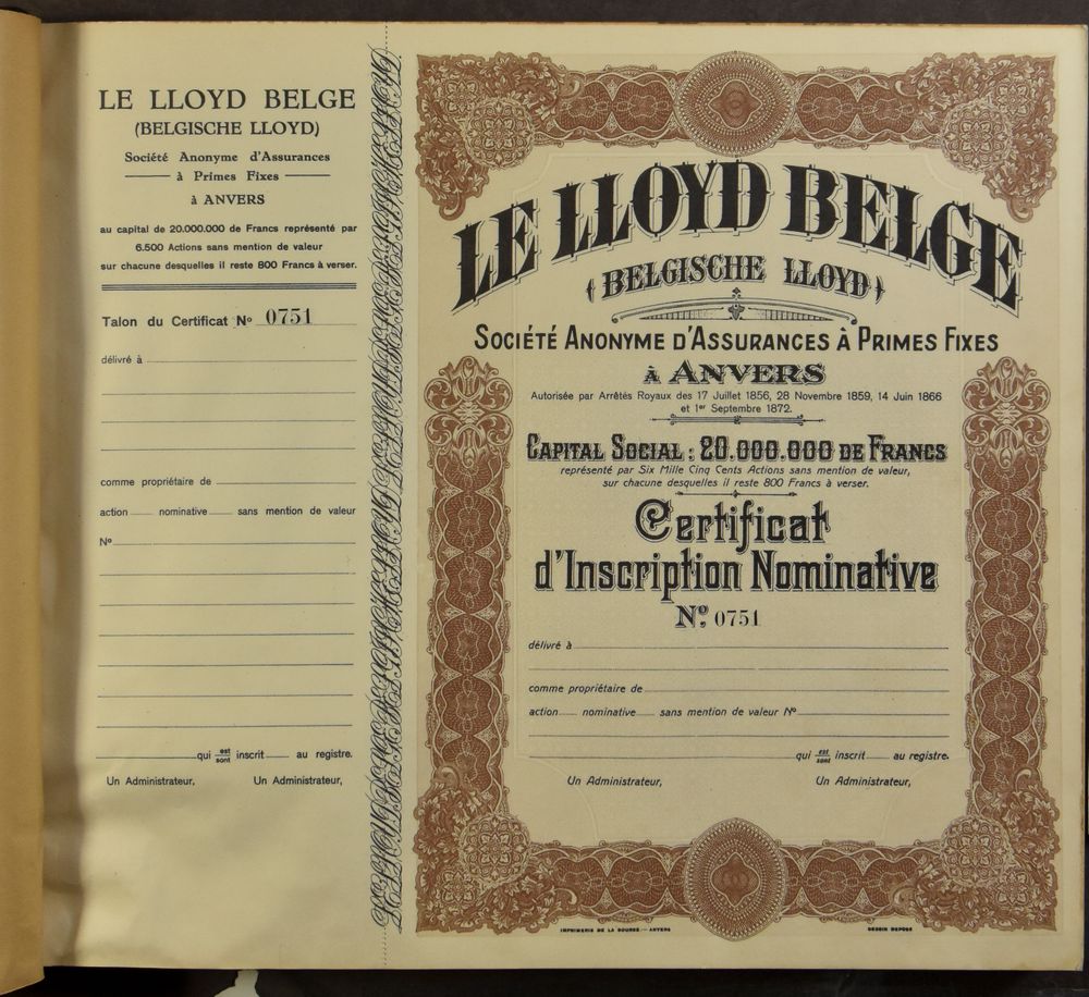 328 imageSHARE: "Le Lloyd Belge" (n° 751/1000), registered share (bound in book)(Image 1) (Image 2) (Image 3)