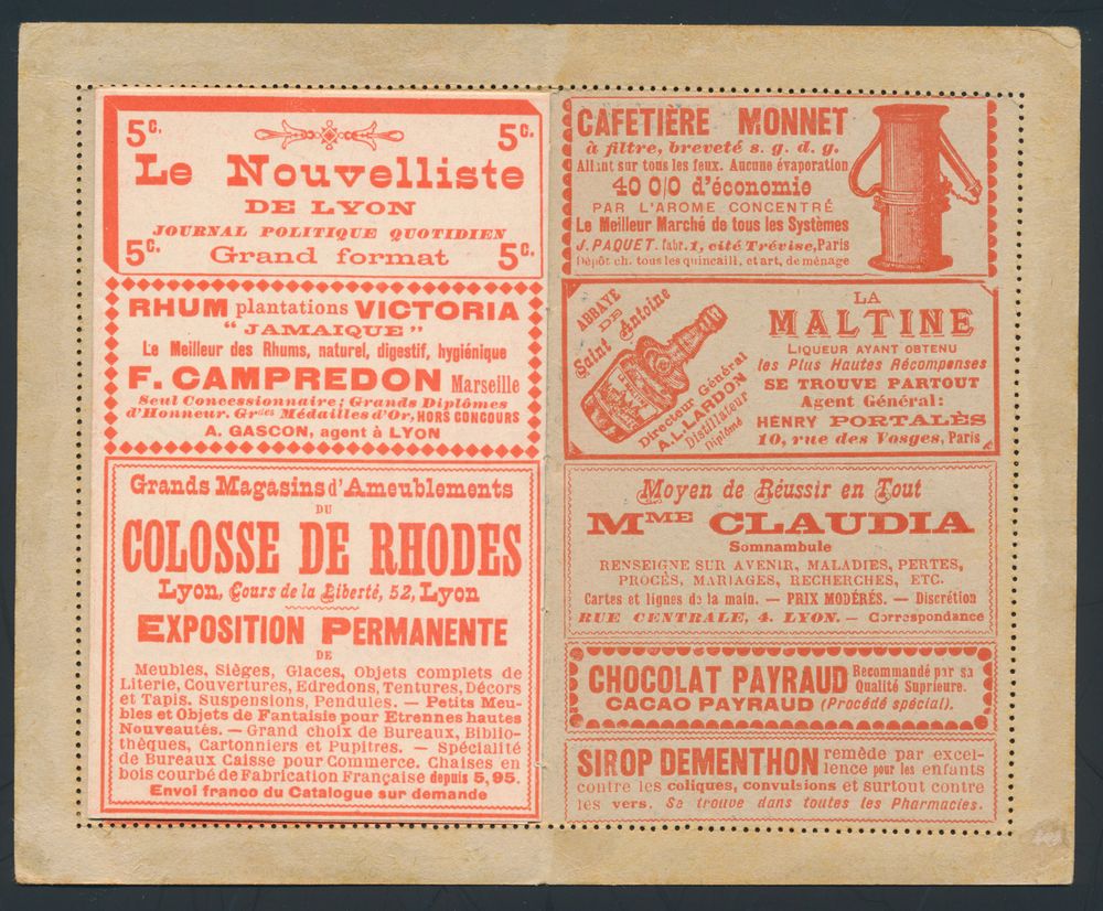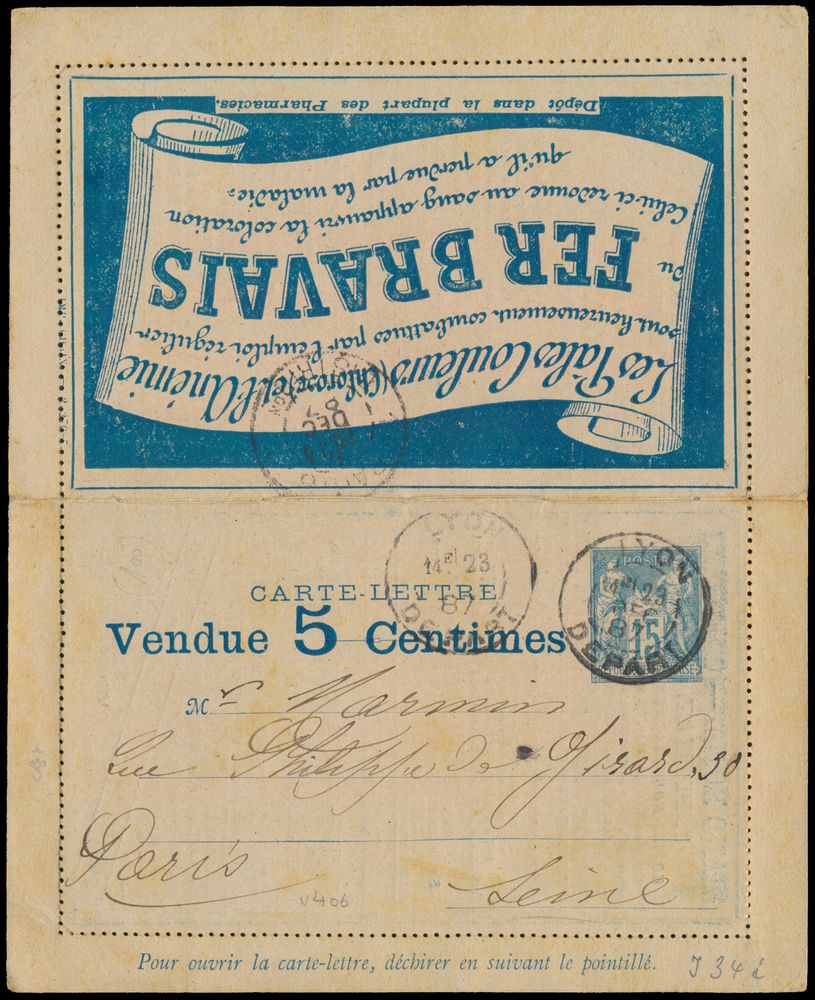 3427 image1887 Carte-lettre "5c. Sage type" with advertisement (PUB), complete from Lyon to Paris, nice item, vf(Image 1) (Image 2)