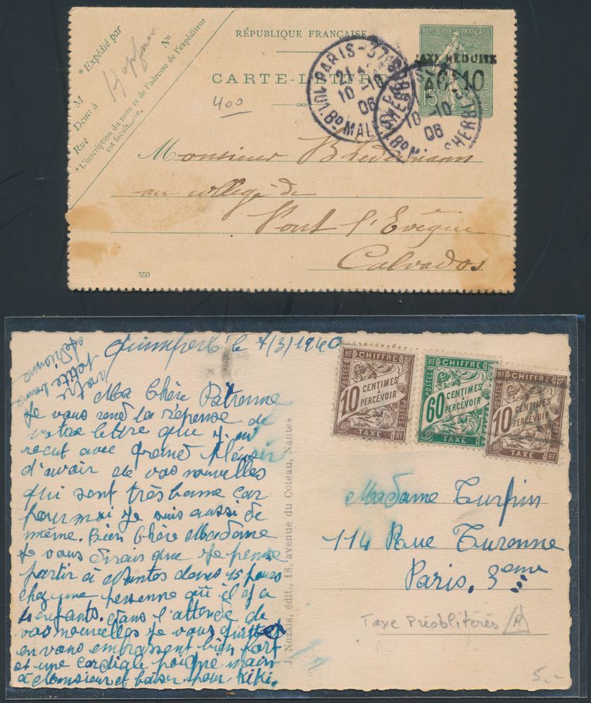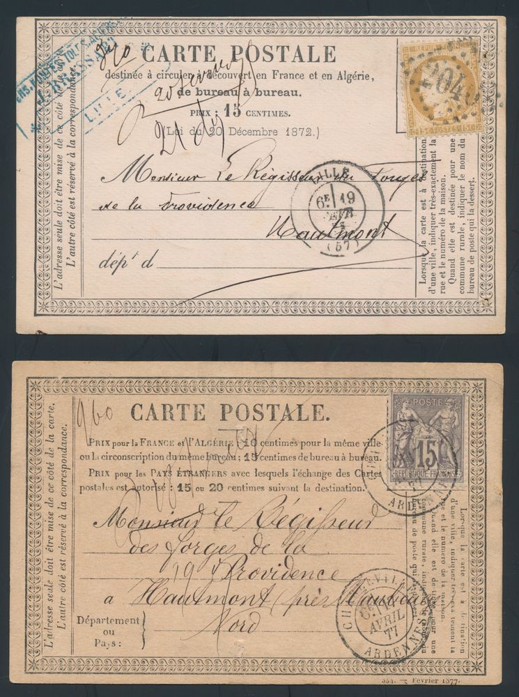 3426 image1873/1878, 36 postcards within Northern France, all sent to Hautmont, mostly franked with Yv. n° 55 Cérès "15c. bistre", others with type Sage, mostly with rusty archive holes, vf/f/to be checked(Image 1)