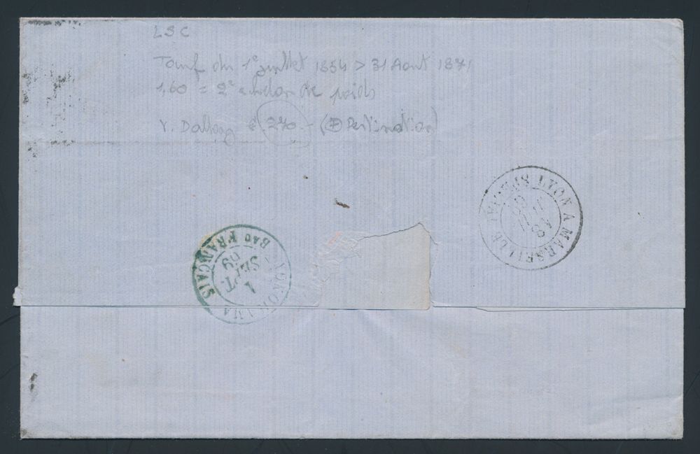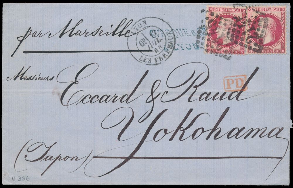 3425 image1868 Nice letter from Lyon to Yokohama by paquebot Lyon with "80c. Napoléon Lauré rose" (2x), correct postage, vf(Image 1) (Image 2)