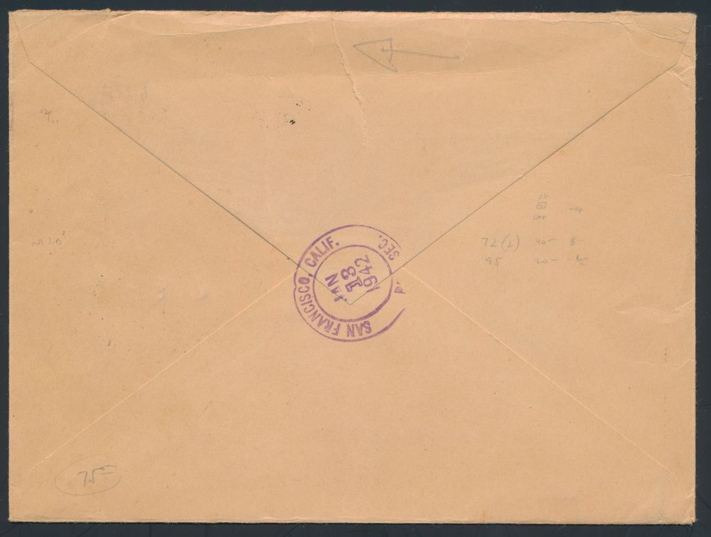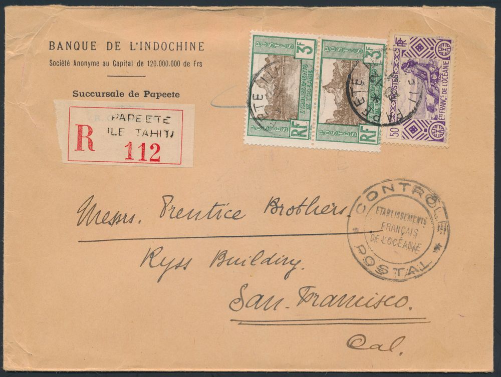3437 image1942 Oceania N° 76 (2x) and 99 on registered letter from Tahiti on 20/12/41 to San Francisco, censorship mark "French establishment in Oceania", arrival stamp San Francisco, 18 January 1942, vf(Image 1) (Image 2)