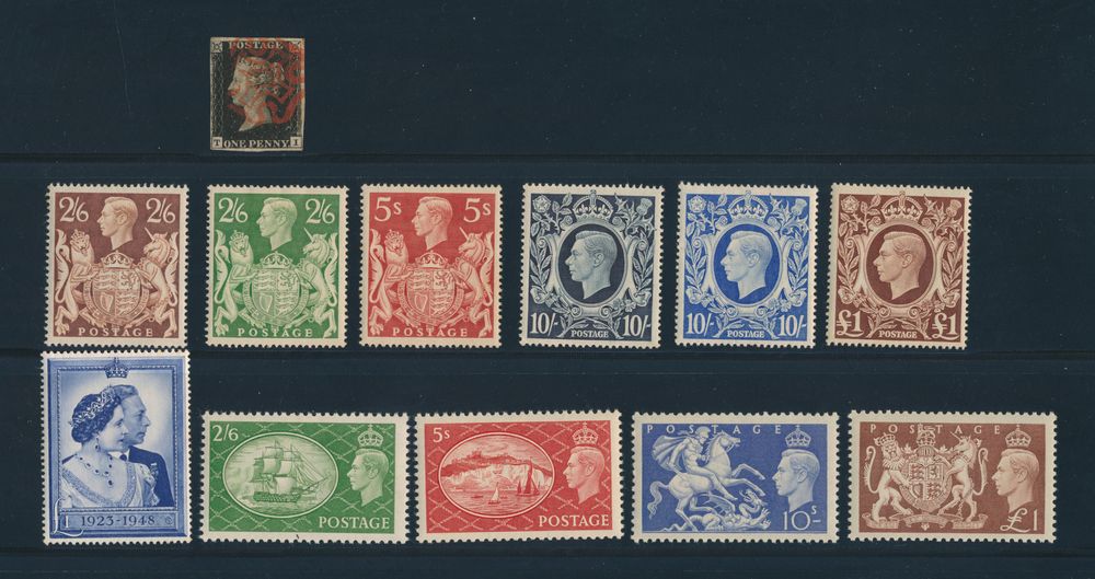 3475 og/0 image1840*1951 Group of better stamps, n° 1 Black Penny, four-sided without defects, 1948 RSW £1, George VI 1939/48 and 1951, vf (S.G. £1,065)(Image 1)