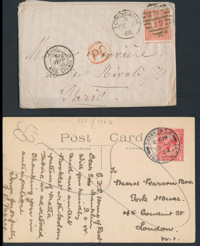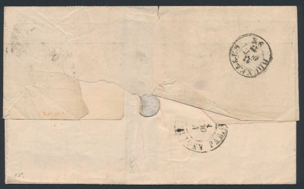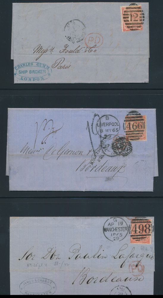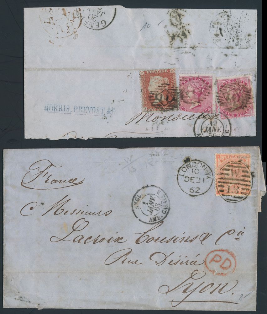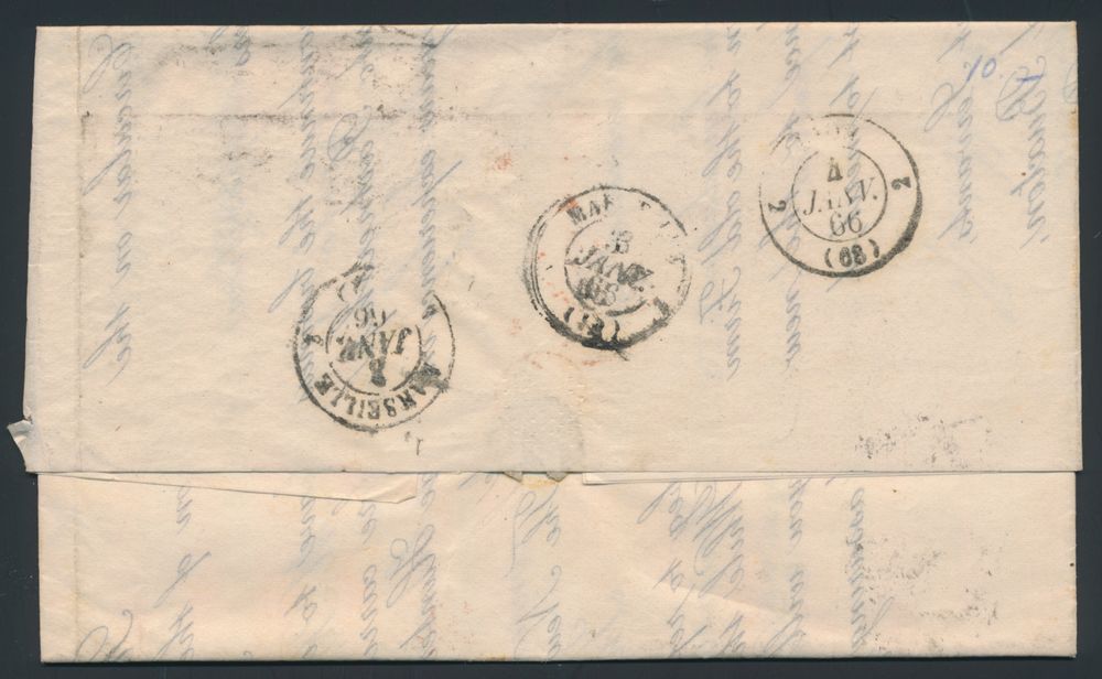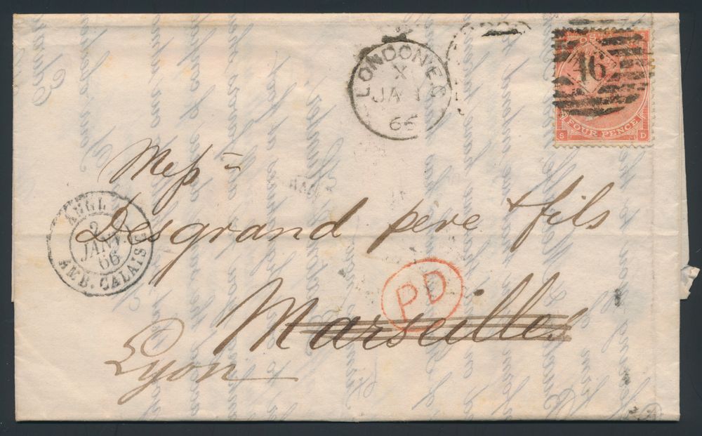 3465 image1865 Letter from London to Marseille, forwarded to Lyon, franked with "4c. bright red" with "Hairlines", including ambulantory postmark "Calais", vf(Image 1) (Image 2)
