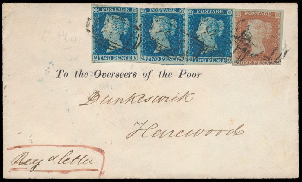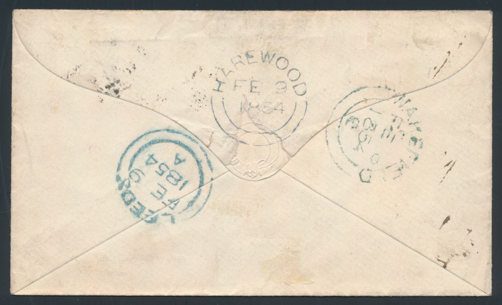 3463 image1854 Registered letter from Alhwick (?) to Harewood with beautiful franking of imperforate "two pence" (strip of 3) and "once penny", rare and interesting, vf(Image 1) (Image 2)