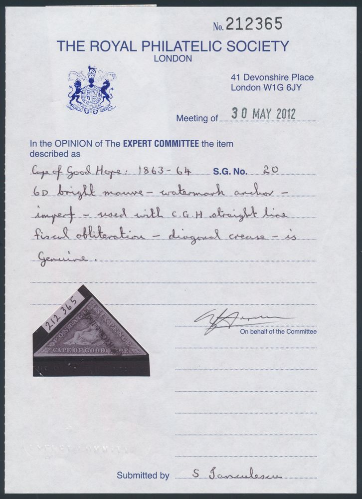 3550 0 imageN° 20 "1864 - 6d. bright mauve" with fiscal line cancel, light crease, interesting certificate RPS, vf/f (S.G. £550 for postal cancellation)(Image 1) (Image 2)