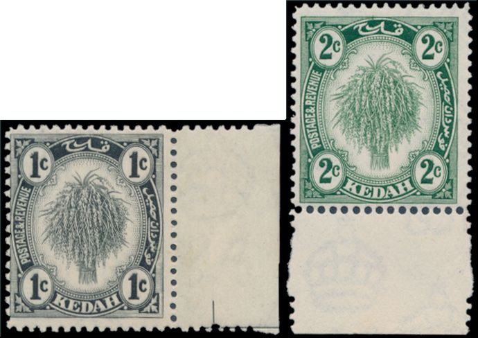 3605 nh imageKedah, n° 68a/69 "1938/40 - sheaf of rice 1c. black + 2c. bright green", "1c." with tinted gum, "2c." slightly tinted in margin, rare, vf/f (S.G. £510)(Image 1)