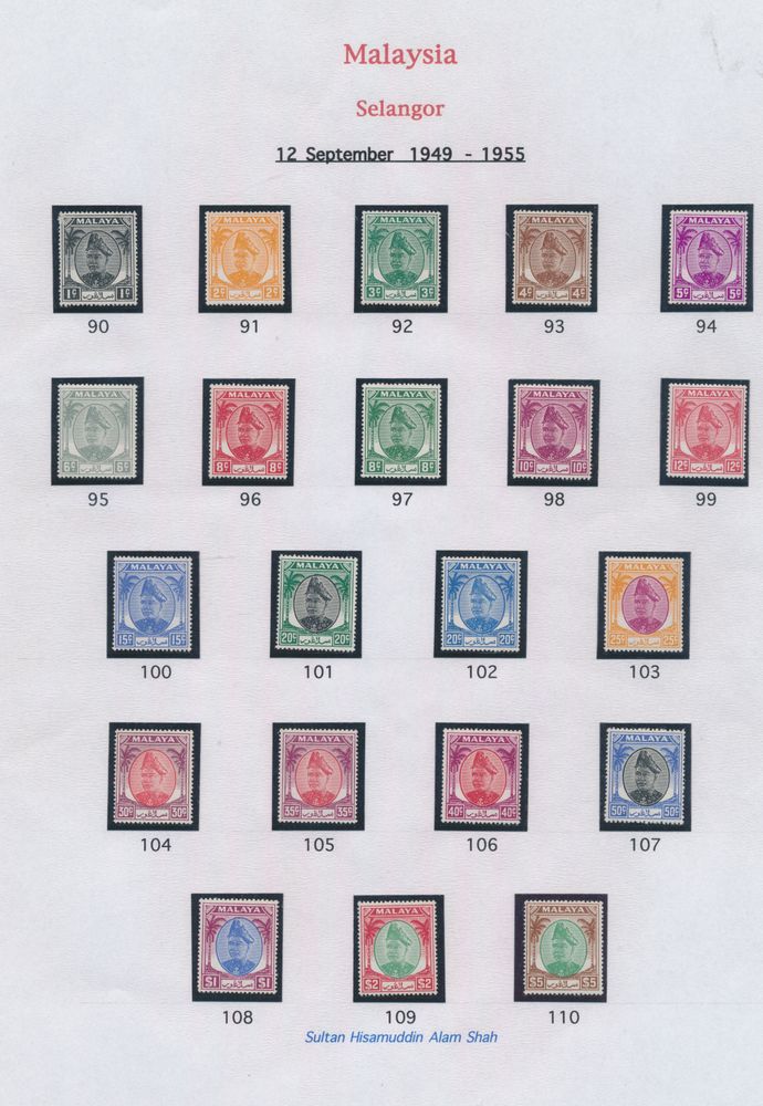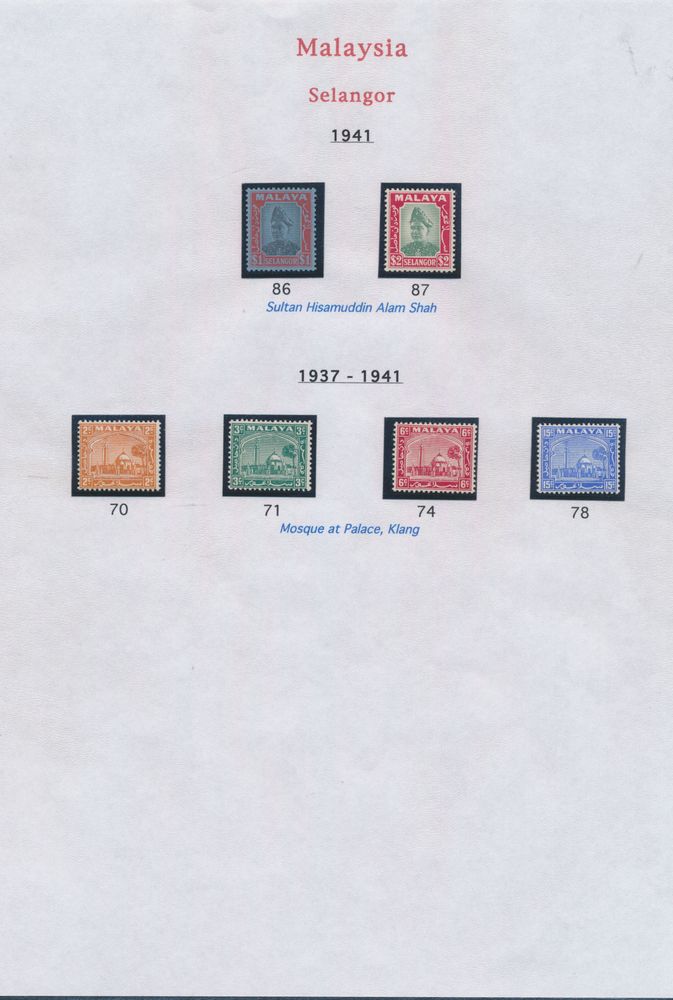 3610 nh image1937/1955 Selangor n° 70, 71, 74, 78, 86/87 (both with standard tinted gum) and n° 90/110 'Mosque and Sultan Hisamuddin Alam Shah' vf (SG £ 228)(Image 1) (Image 2)