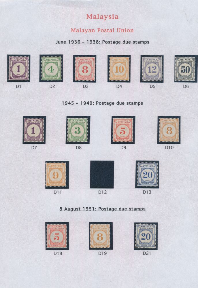 3606 nh image1936/1937 'George VI period' Malayan Postal Union Penal postage N° D 1/13, 18/19 and 21, vf (SG £398)(Image 1) (Image 2)