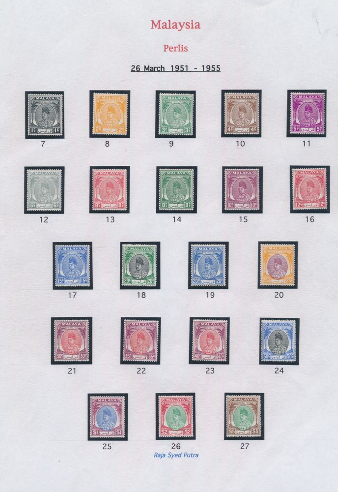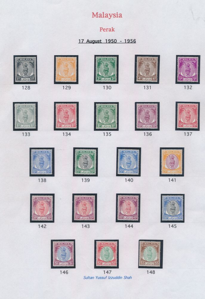 3615 nh image1950/1956 Perak N° 128/48 and Perlis 7/27, postage stamp series Sultan Izzuddin Shah and Raja Syed Putra, vf (SG £ 310)(Image 1) (Image 2)