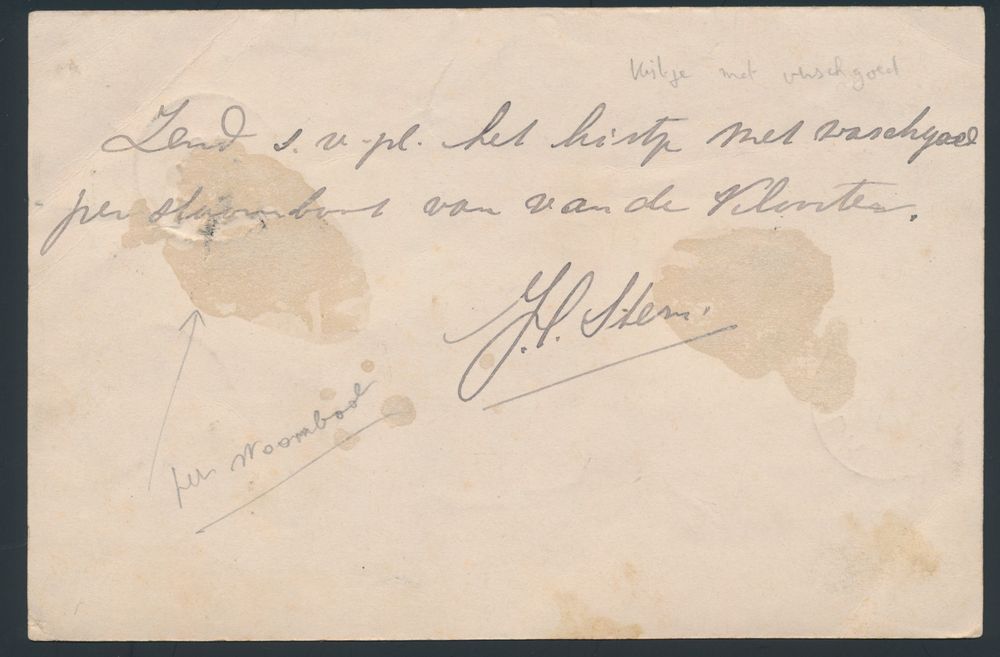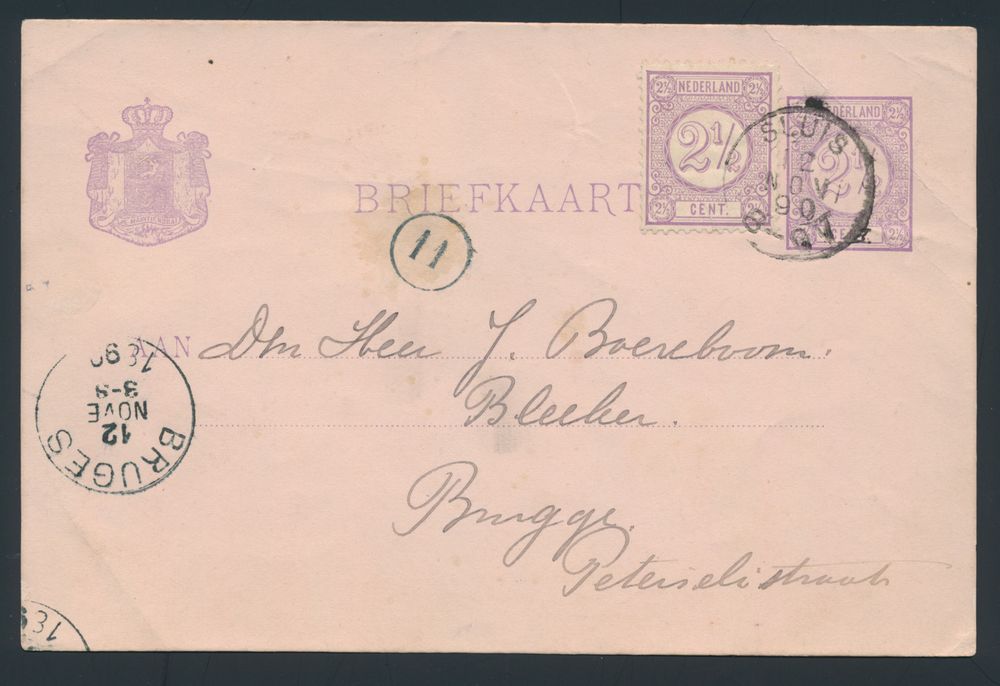 3797 image1890 Postcard "2 1/2c." with additional postage "2 1/2c." from Sluis by steamboat to Bruges, catalogue value for small round stamp 50 points, vf(Image 1) (Image 2)