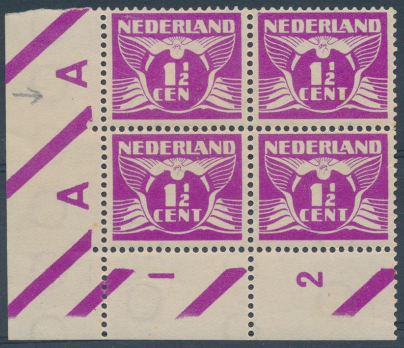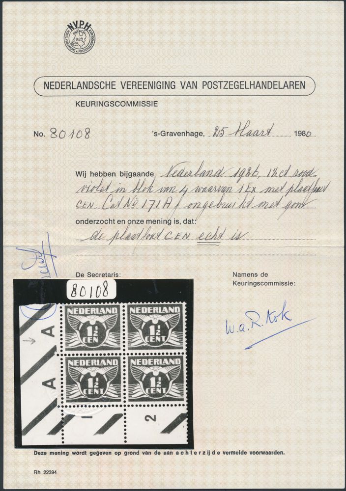 3786 og imageN° 171 Af "1928 - 1 1/2 CEN plate error in corner block with other normal stamps", with certificate, vf (NVPH +€150)(Image 1) (Image 2)