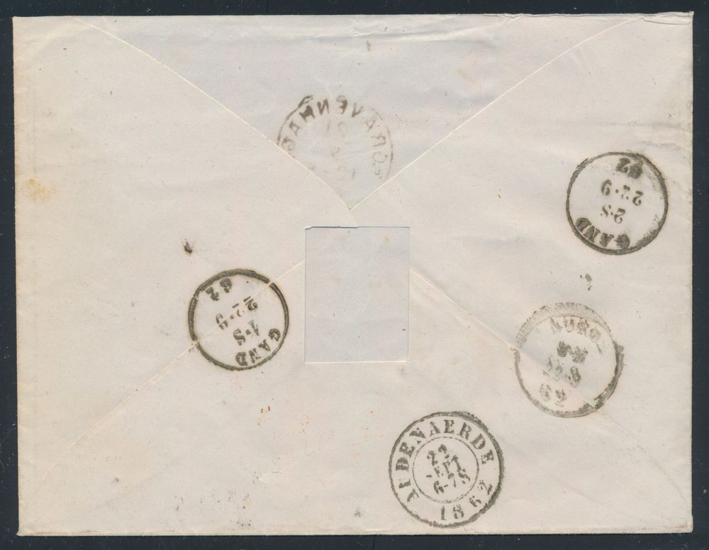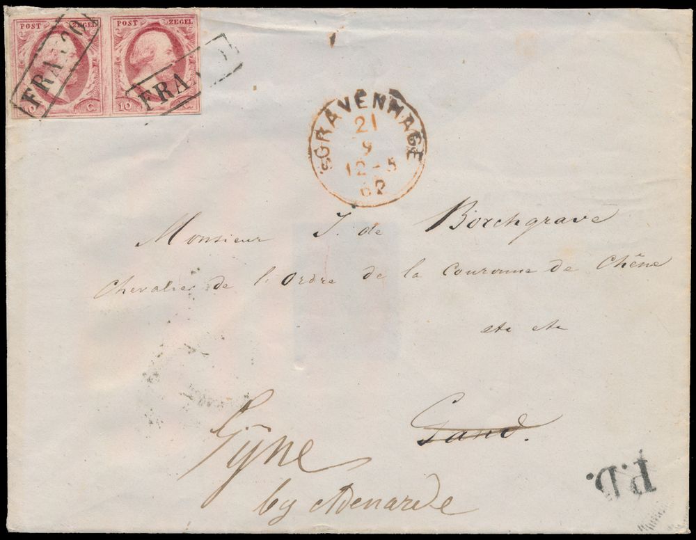 3791 image1862 Letter from The Hague to Audenaerde franked with a nice pair of "10c. carmine", plate VIII, part of the back (including flap) missing, but high stamp value for a pair of this plate, vf/to be checked(Image 1) (Image 2)