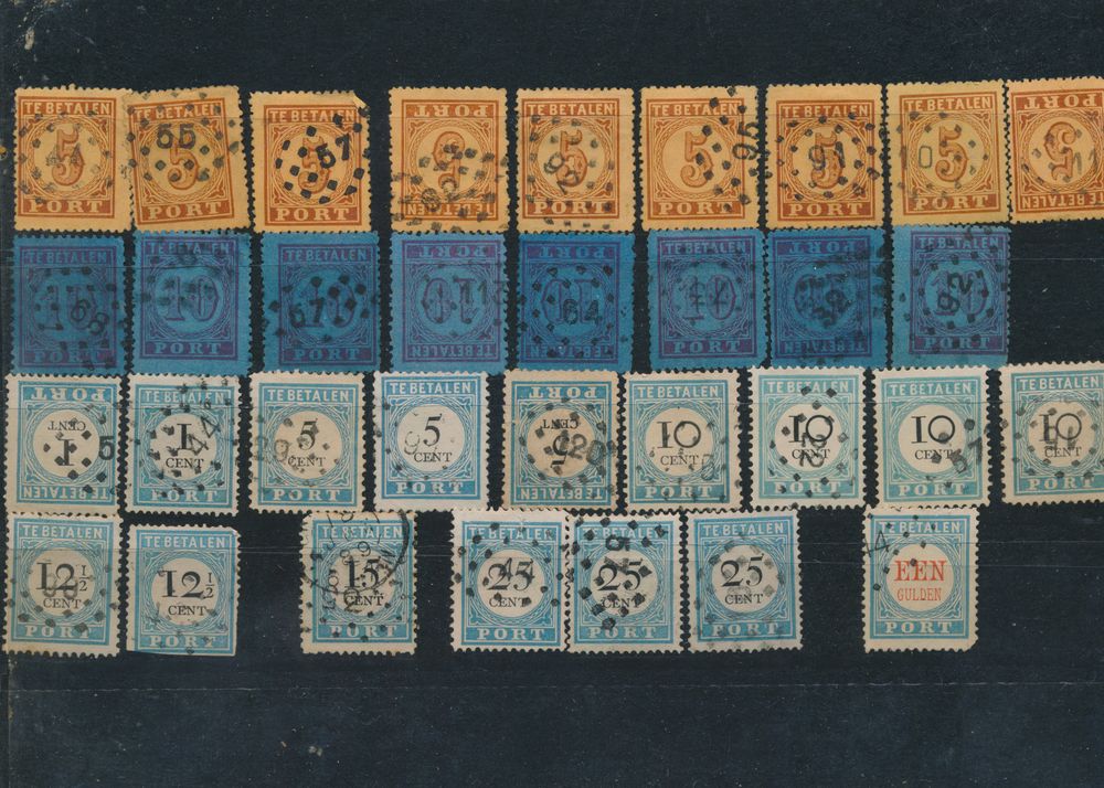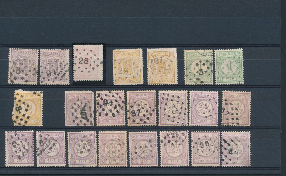 3781 0 image1869/1887 Accumulation “Dotted cancels” on national coat of arms, number and penalty postage (54x) of which national coat of arms n° 16 and penalty postage n° 1 and 2 (17x), vf/f/to be checked(Image 1) (Image 2)