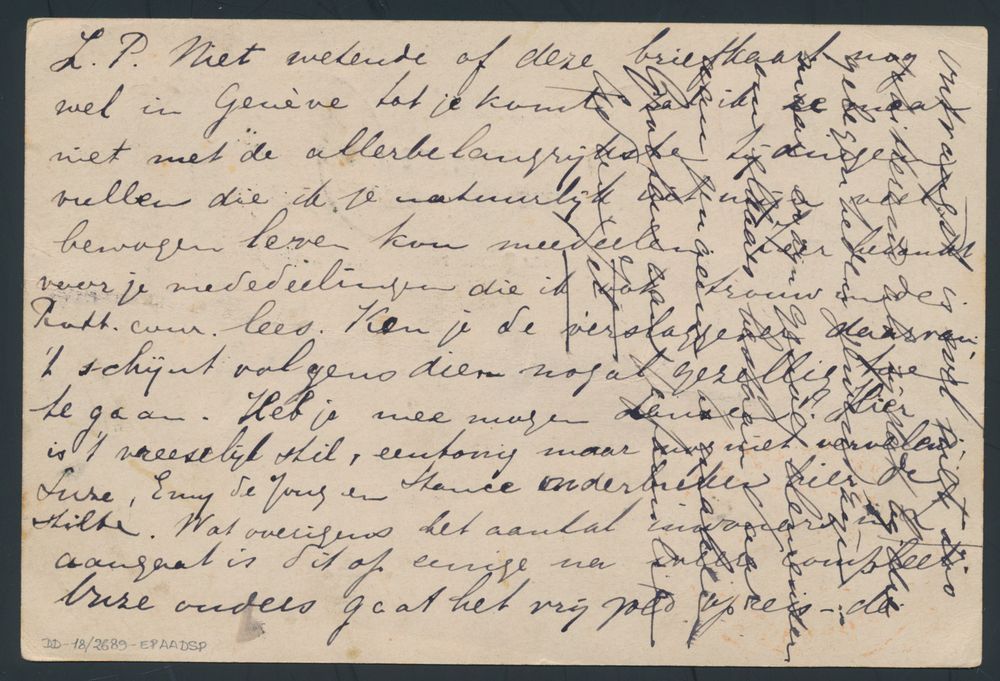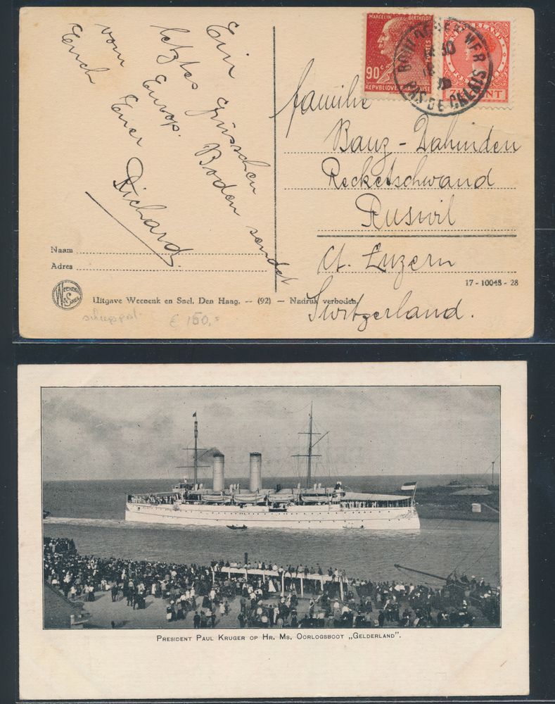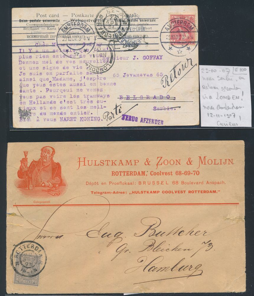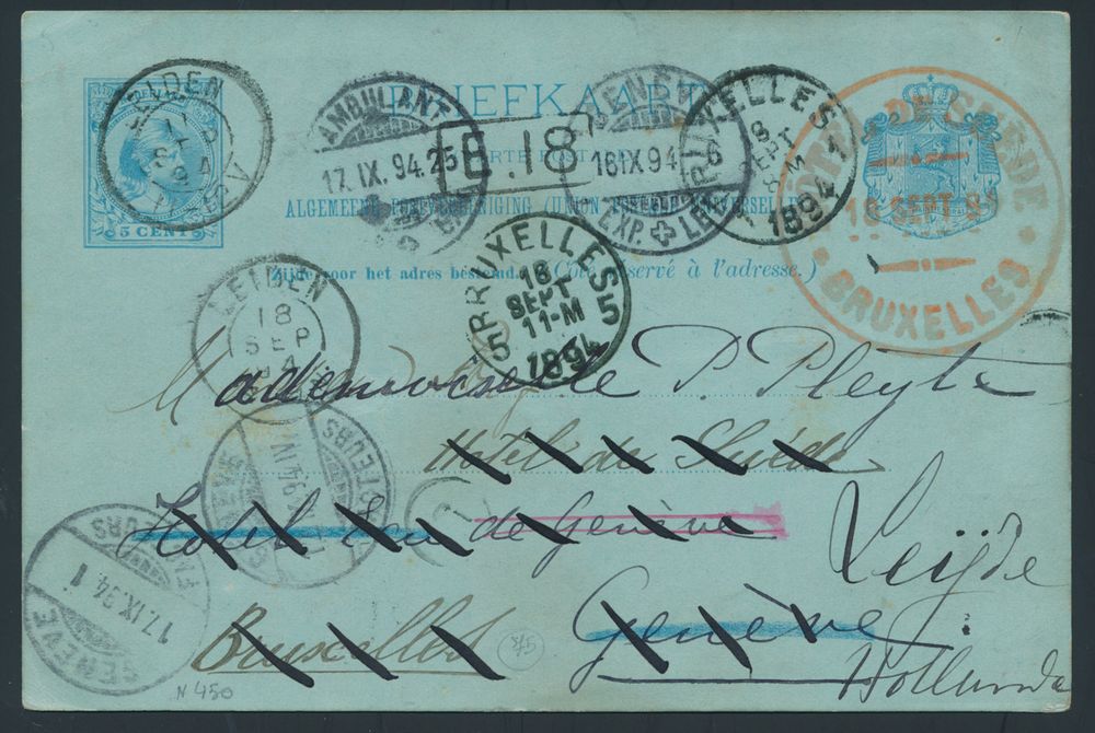 3798 image1894 Nice stray card from Leiden to Geneva, forwarded to Brussels with Hotel cancellation in red "BXL" returned to Leiden, spectacular, vf(Image 1) (Image 2)