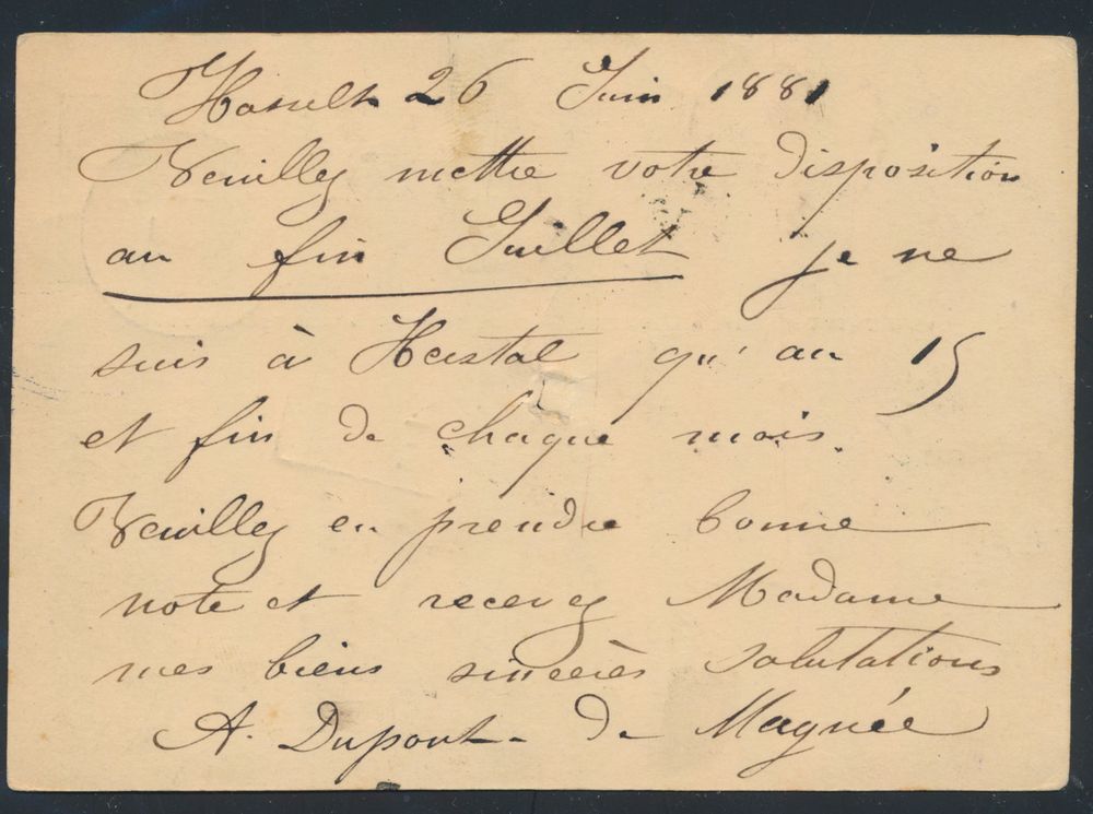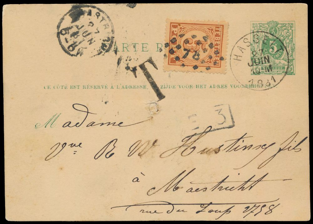 3795 image1881 Postcard from Hasselt to Maastricht, border rate, but postcards were subject to the letter rate, hence penalty postage "5c." (n° 1), interesting and rare, vf(Image 1) (Image 2)