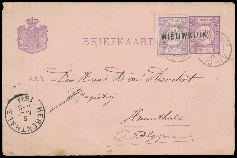 3796 image1884 Beautiful postcard "2 1/2c." from Nieuwkuik to "Herenthals" with additional postage "2 1/2c.", beautiful combination, vf(Image 1) (Image 2)