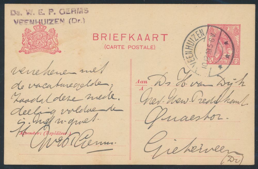 1919 Postcard from 'Rev. Germs' from Veenhuizen prison to