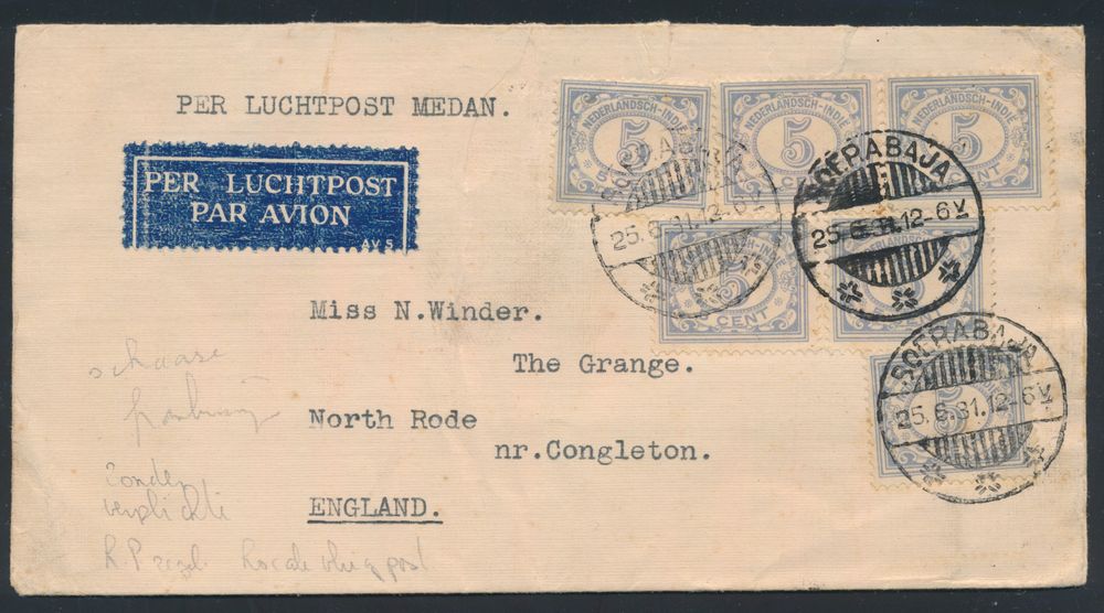 3897 image1931 Airmail letter Medan, from Surabaya to North Rode (United Kingdom) with unusual franking of n° 107 (6x), vf/f(Image 1) (Image 2)