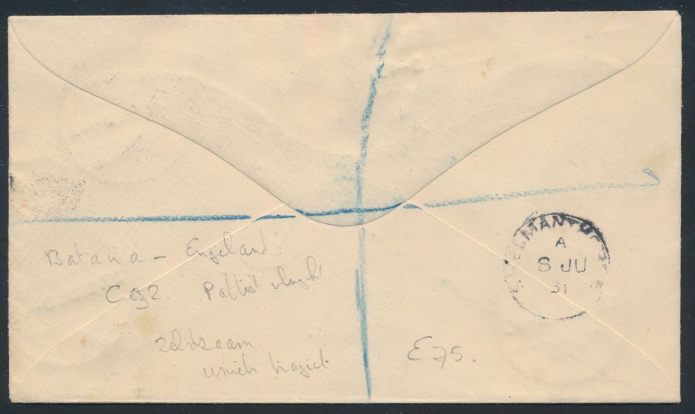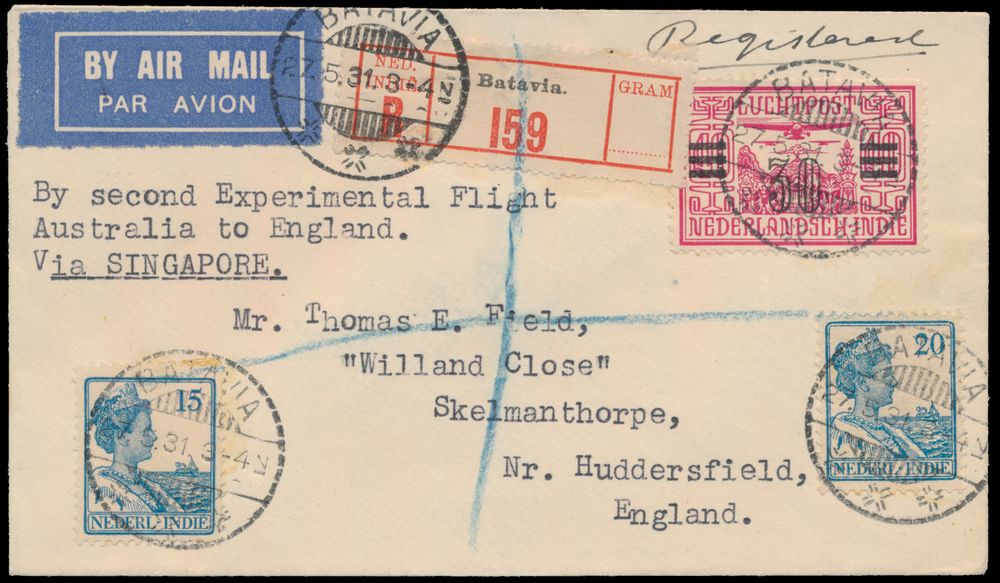 3896 image1931 Registered airmail letter "by Second Experimental Flight Australia to England" via Singapore from Batavia to Skelmanthorpe (Great Britain), interesting item, vf(Image 1) (Image 2)