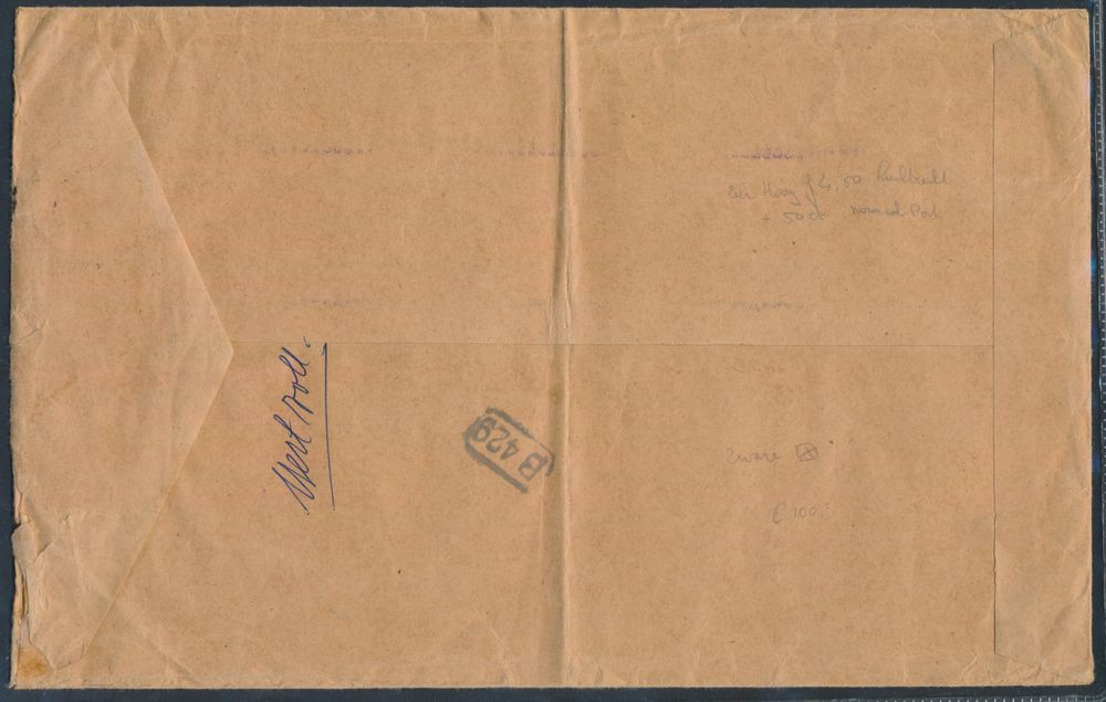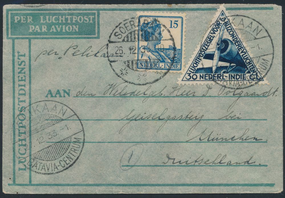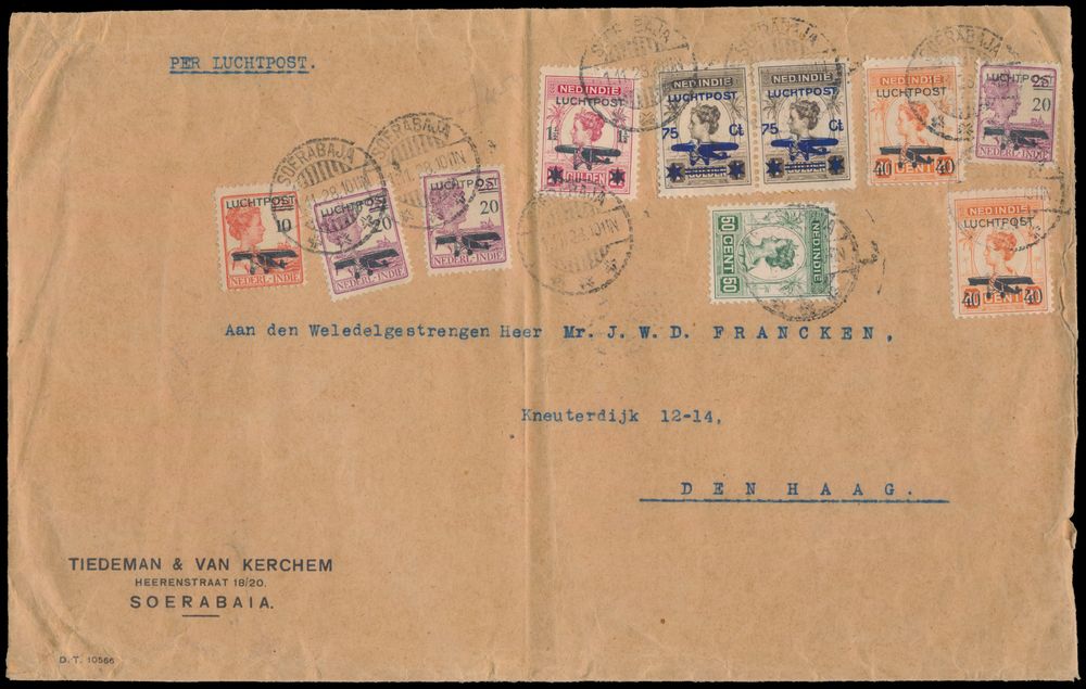 3895 image1928 Large-format airmail letter from Surabaya to The Hague franked with Harting, mainly airmail, including n° 4 (in pair) and 5, some signs of wear, f (High value)(Image 1) (Image 2)
